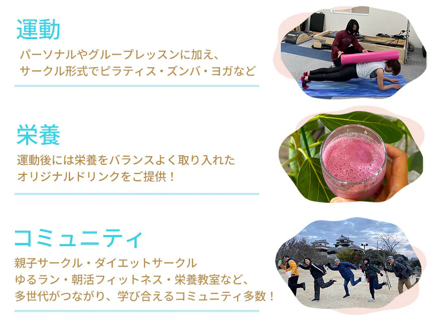 運動は、パーソナルやグループレッスンに加え、サークル形式でピラティス・ズンバ・ヨガなど、楽しみながら継続できるプログラムを提供しています。