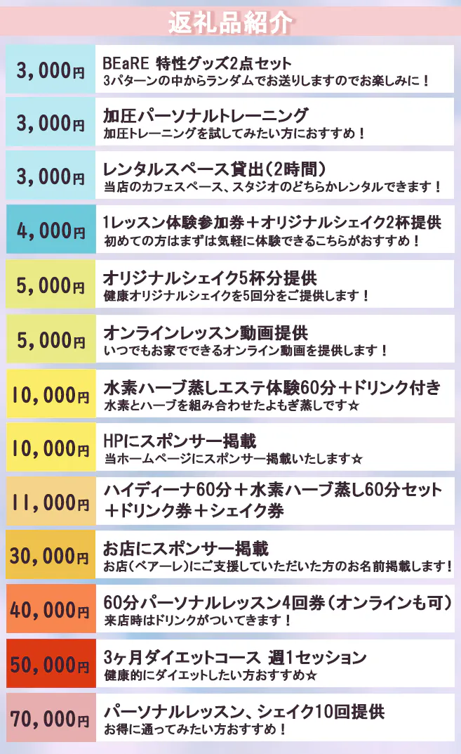2025/08/02 16:09この度、クラウドファンディングを無事、目標額クリアすることが出来ました。支援してくださった皆様に心から感謝致します☆運動と栄養、コミュニティを融合させたBEaREにたくさんの方が来ていただけるよう、支援金を使わせて頂き充実させて頂きたいと思います。皆様に返礼品のご連絡をさせて頂きますので、どうぞよろしくお願い致します☆皆様のご来店を楽しみにお待ちしております。今後ともよろしくお願い致します。BEaRE 小倉三鈴 もっと見る