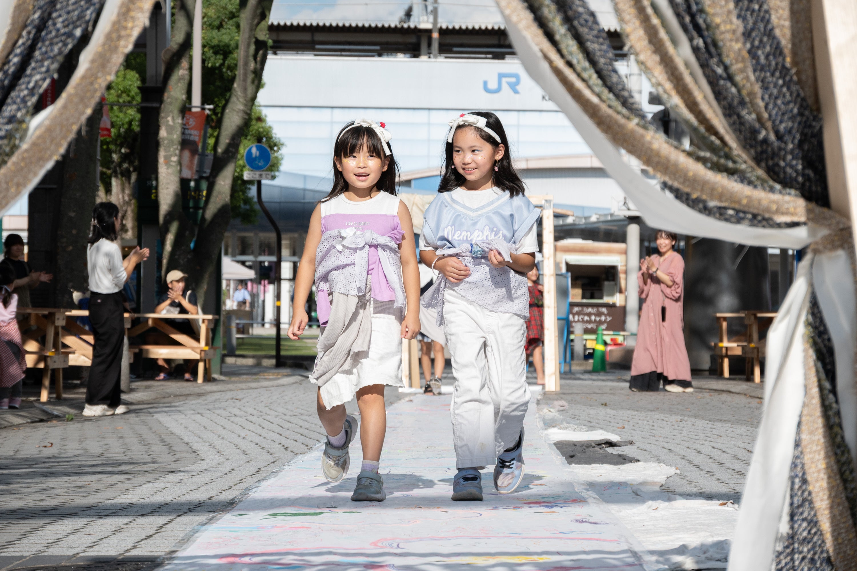 商店街の道路に広げた模造紙に落書きをしてランウェイをつくり、廃材で作ったドレスを着た子どもたちがランウェイを闊歩。