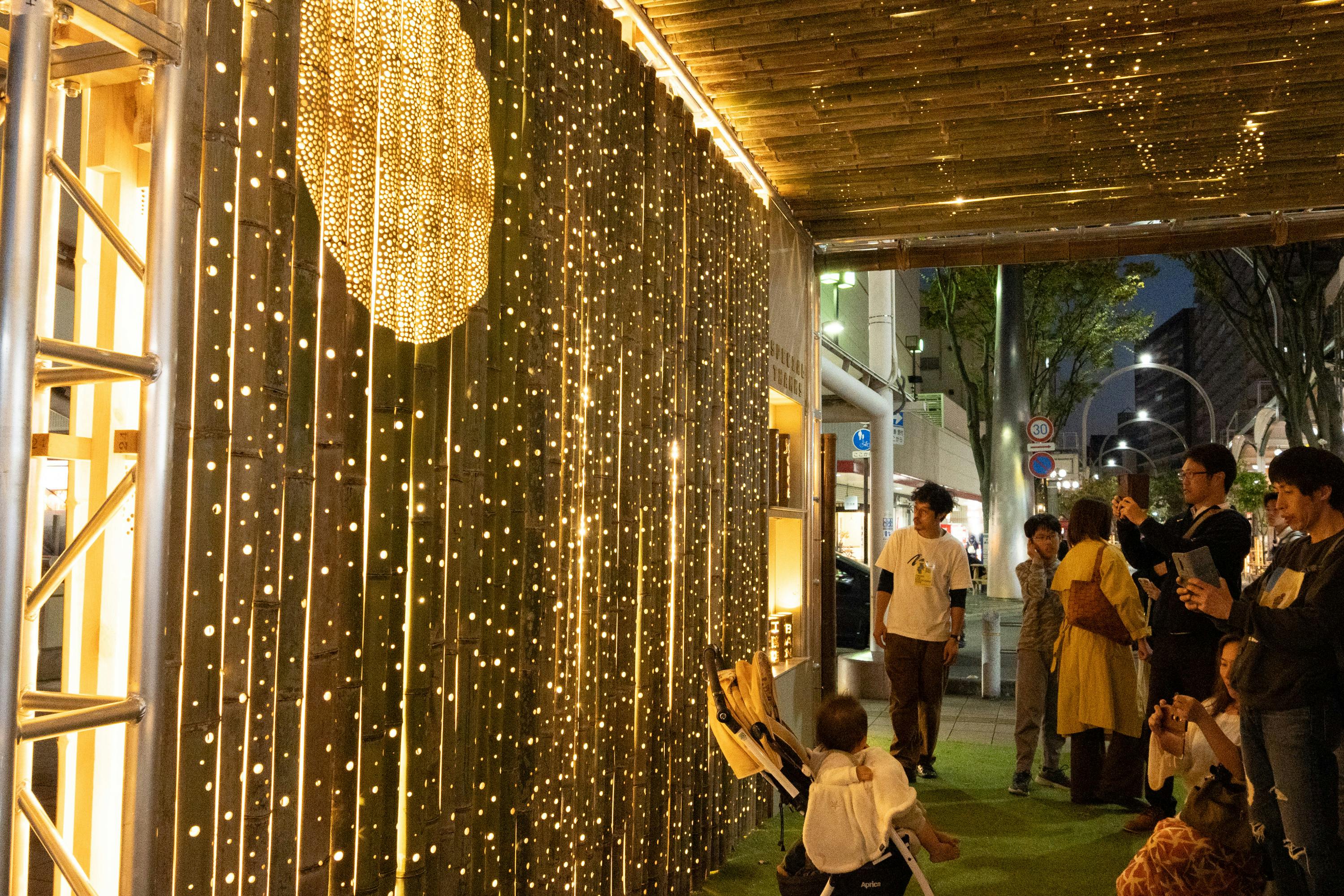 (雨のため施工が遅れた通路型モニュメントは、竹の貼り付けを夜通し作業してくださいました。Bamboo fam.の稲岡さん、荻内さん、谷口さん、電気工事士の福本さん、森建築工房の森さん、ありがとうございました!!!)