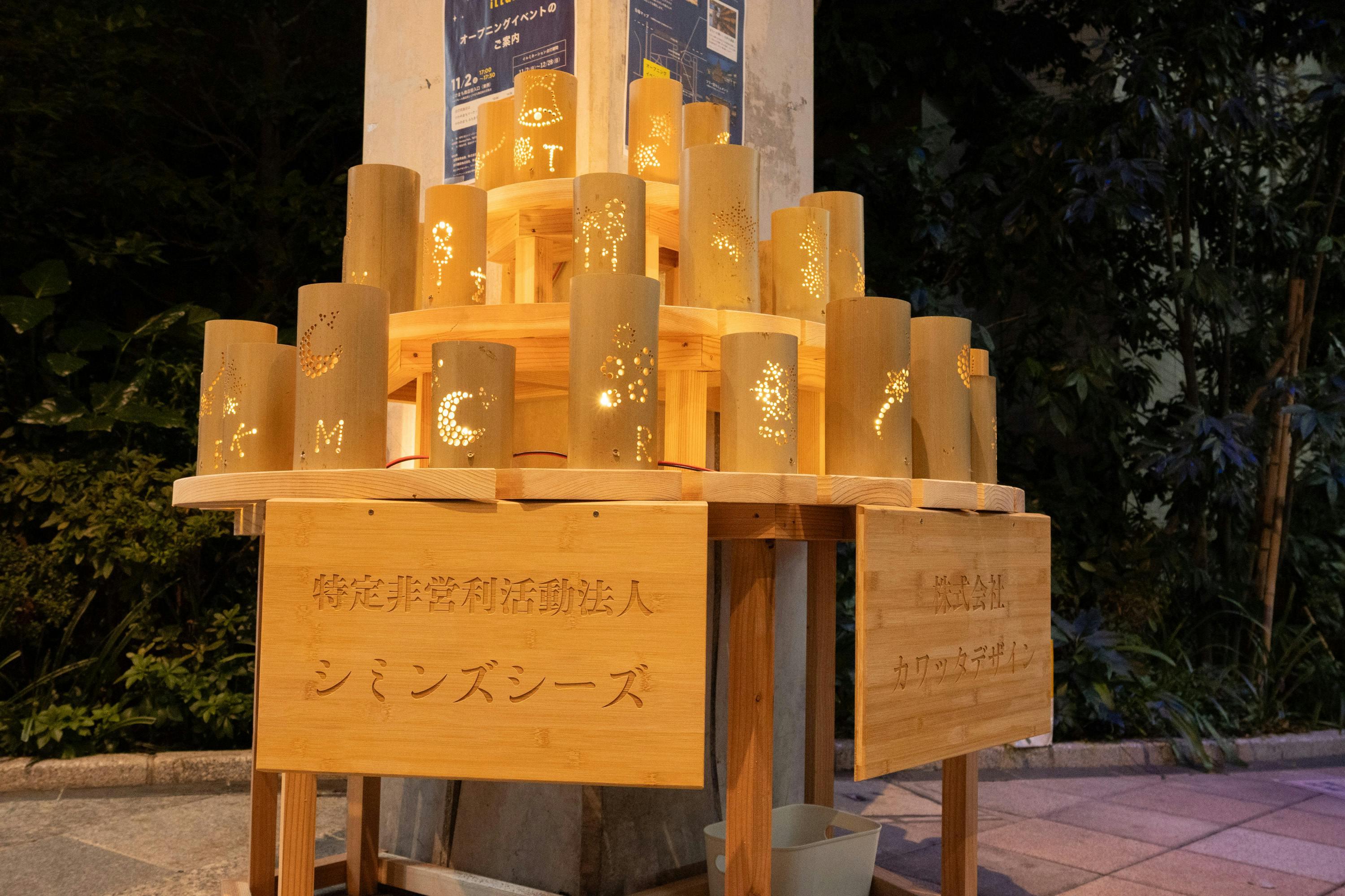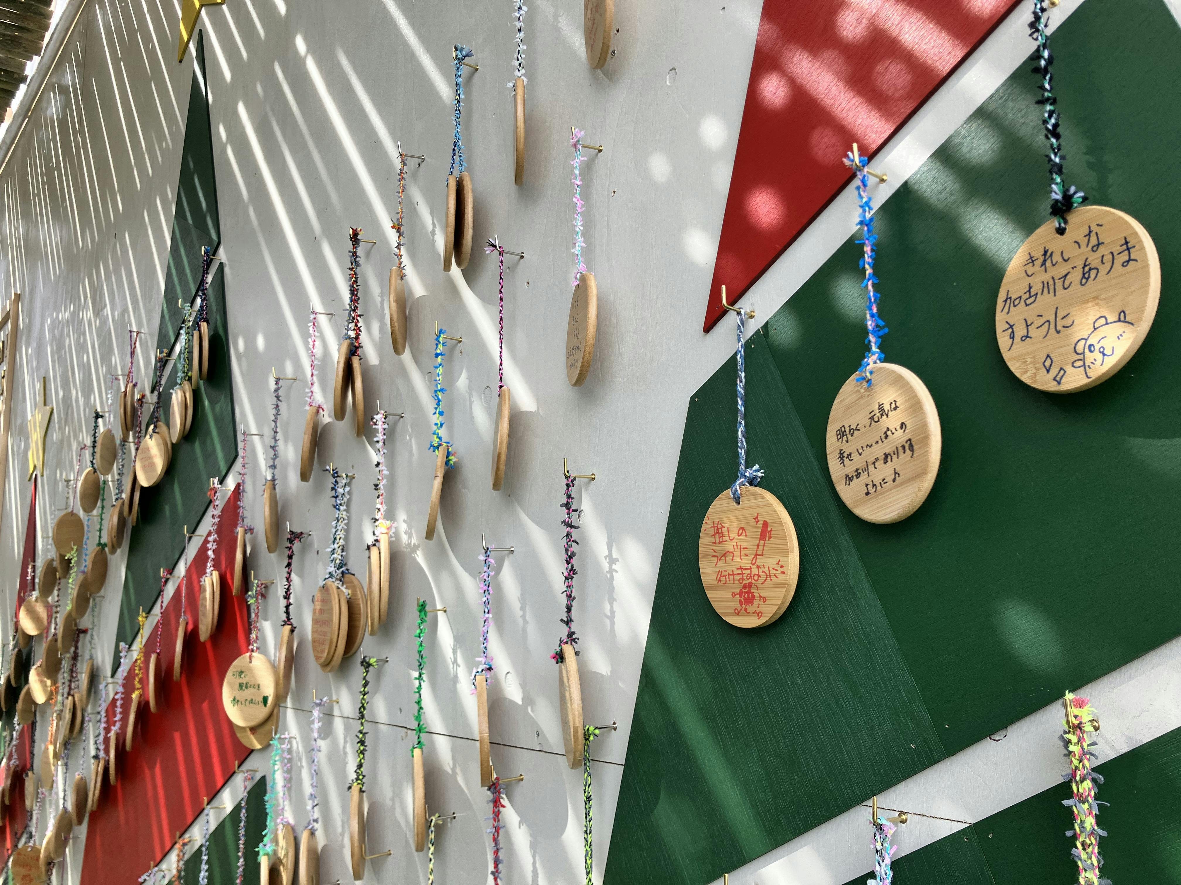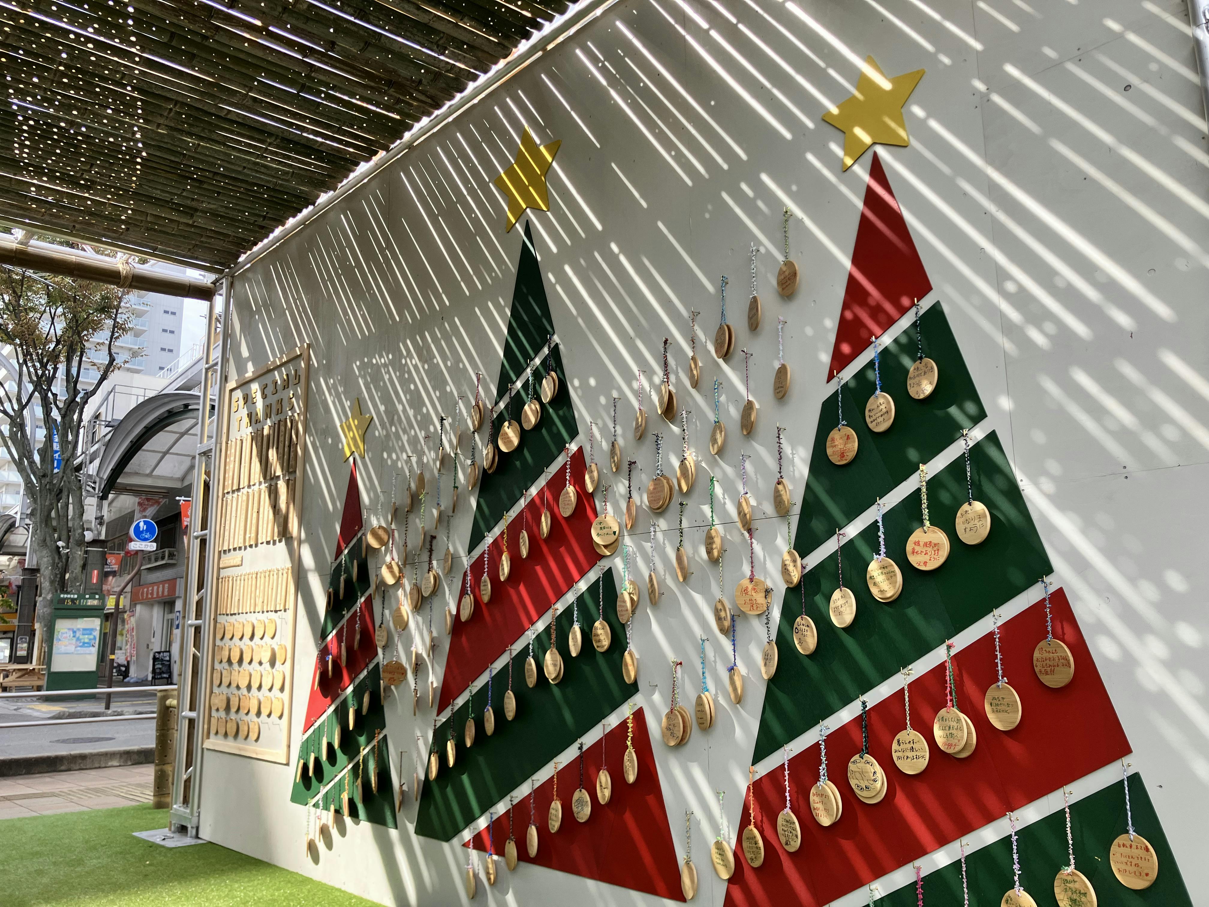 通路型モニュメントの内側壁面には、竹札を竹絵馬とツリーのオーナメントに見立てた「まちへの願い事コーナー」も設置。(日中に見ても美しい!!)