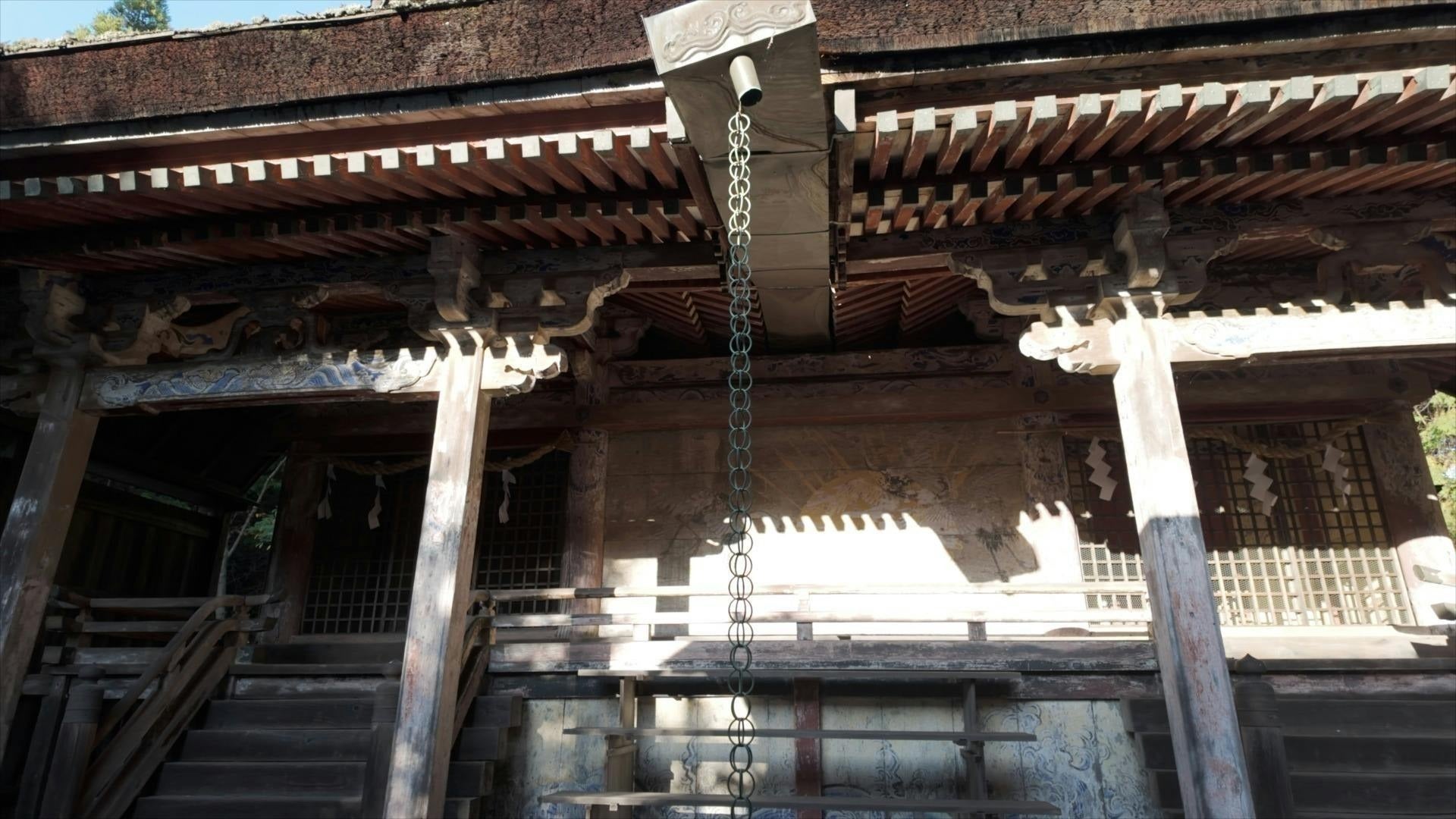 また、 本殿2棟をつなぐ障壁の正面には、伝説と相まった歴史ある日食を表す絵が描かれているのですが、その絵もだんだんと薄くなり、何が描かれているのかもわかりづらくなっています。