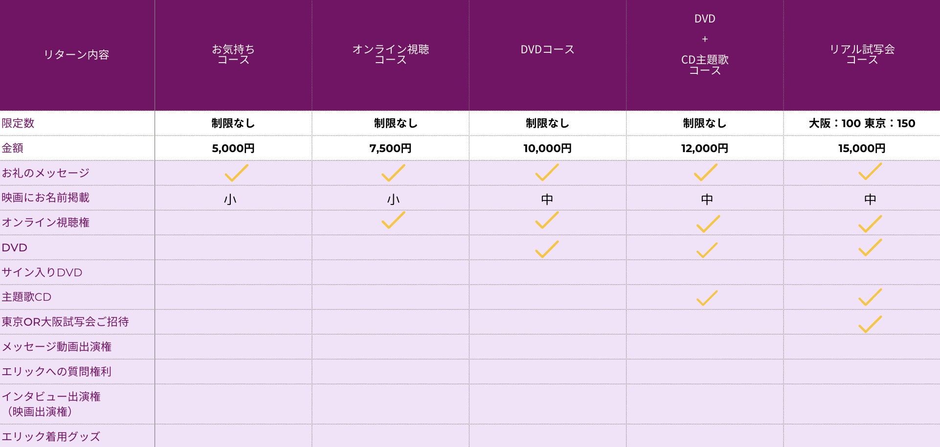 オンライン視聴コースから、DVDコース、サイン入りDVDコース、そして東京・大阪での特別試写会ご招待コースまで。