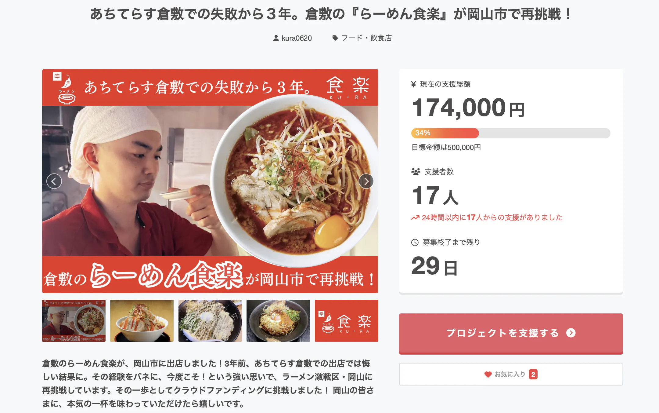 『あちてらす倉敷での失敗から3年。倉敷の「らーめん食楽」が岡山市で再挑戦!』プロジェクト開始から1日が経ちました。