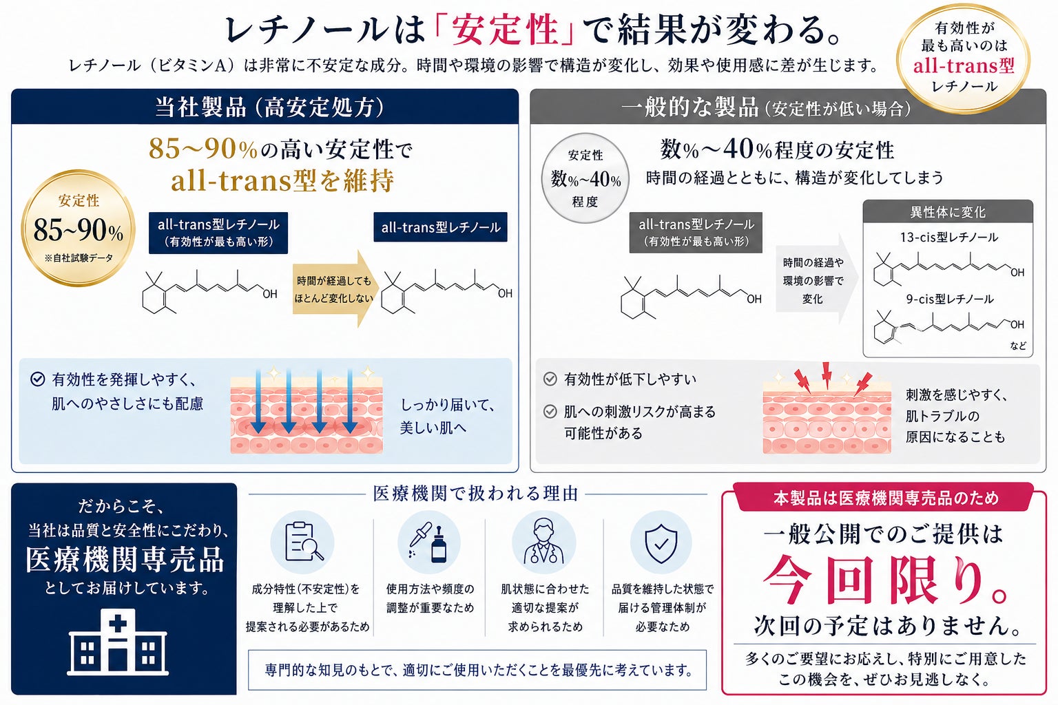 レチノールの価値は、「濃度」ではなく**“どの状態で肌に届くか”**で決まります。