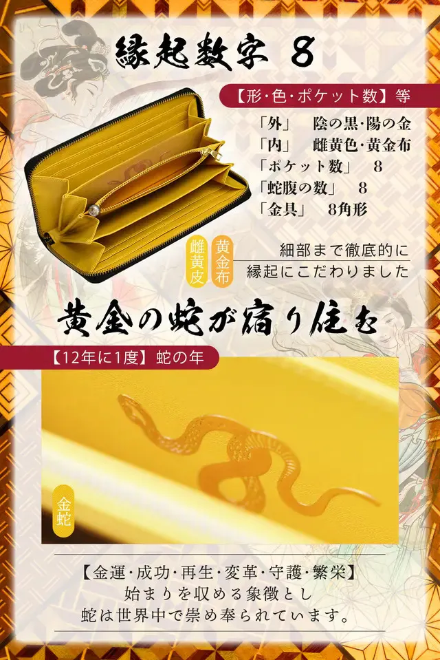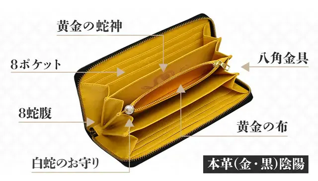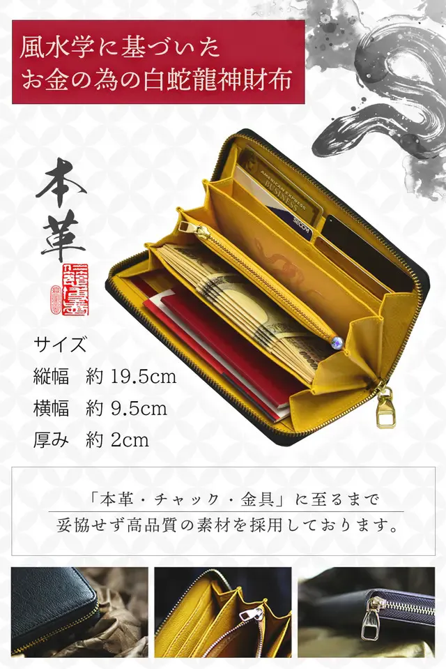 サイズ:[約]縦9.5cm×横19.5cm×幅2cm重量:[約]175g素材:牛本革(外側)・合皮(内側)・一部金色布(内側)・ファスナー・チャーム八角金具 : 黄金合金カラー:金「金篝(きんかがり)」・黒「黒漆(くろうるし)」仕様:カード入れ×8御札入れ×4ファスナー付小銭入れ×1大型収納ポケット×2八角金具×2