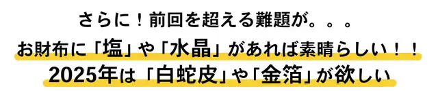 お財布の運気を整えて、運気を綺麗にする浄化の御塩(みしお)と本水晶紛(ほんすいしょうふん)さらに特別に2025年、白蛇(抜け殻)・金箔(きんぱく)で縁起を限界まで担ぐ。