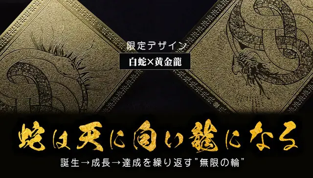 黄金に輝くカードの表には“白蛇が龍神の尾を咥え・龍神は白蛇の尾を咥える”白蛇は太陽を龍神は月光を吸収し、力の循環を願う縁起を考え抜かれた究極のデザイン。