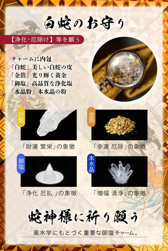 本物の白蛇の皮・金は非常に相性がよいとされ、良い氣を高め呼び込むとされています。塩・水晶による「浄化や厄を跳ね除ける」効果に「達成や変革・輝かしい未来」を願います。