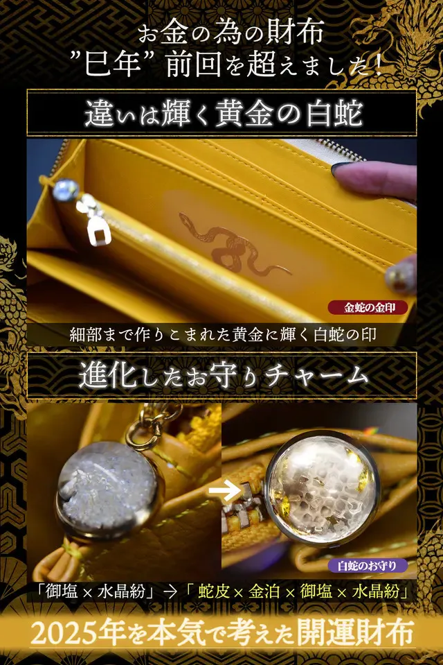 10名の風水師が考え抜いた、内側が「8・黄色・白蛇・金・塩・水晶」のお財布は強力なパワースポット!白蛇様が居心地よく住めるとされる環境です!