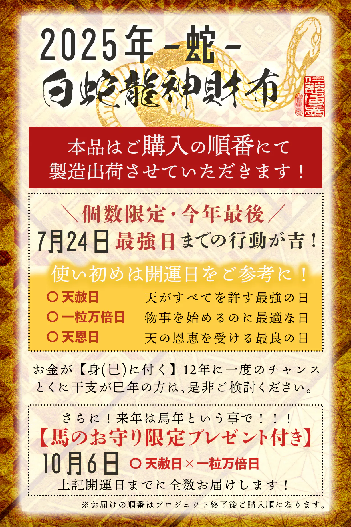 昨年!圧倒的な縁起力で数々の”嬉しい体験談”が届きました!中でも本年も企画して欲しい!と多くのお声をいただきましたので、2025年も本気でやりますっ!やり切りますっ!