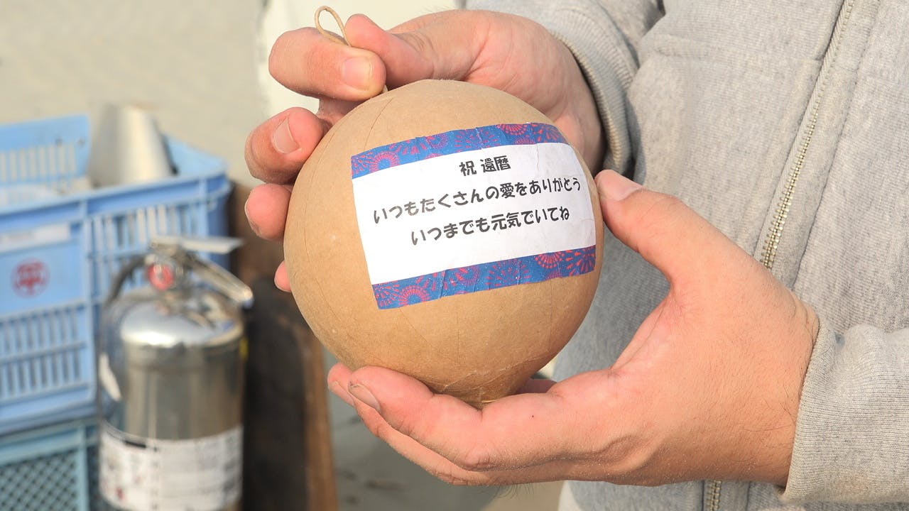 ・還暦花火の日に、あなたのメッセージを貼り付けた3号玉を打ち上げます。