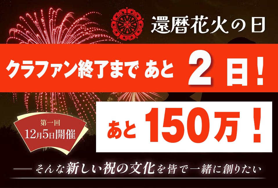 現在、全国の花火師の皆様との「還暦花火の日」実現の約束を果たすには、あと150万円が必要です。