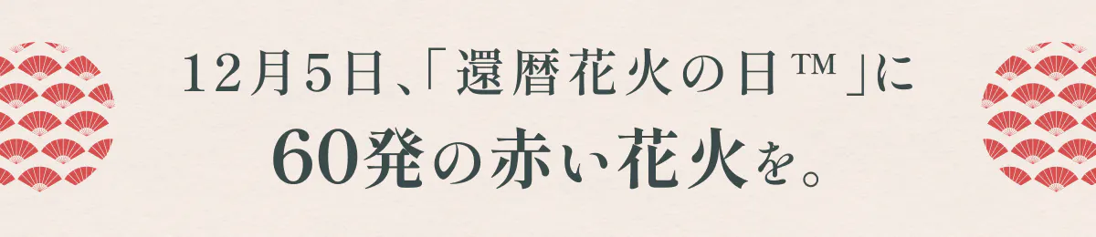 12月5日、全国の空に同じ赤い花火が一斉に咲き誇る―。この日、日本中が還暦を迎える約174万人を祝う特別な時間になります。60年の歩みをたどるように、赤い花火を一発ずつ、ゆっくりと60発打ち上げます。