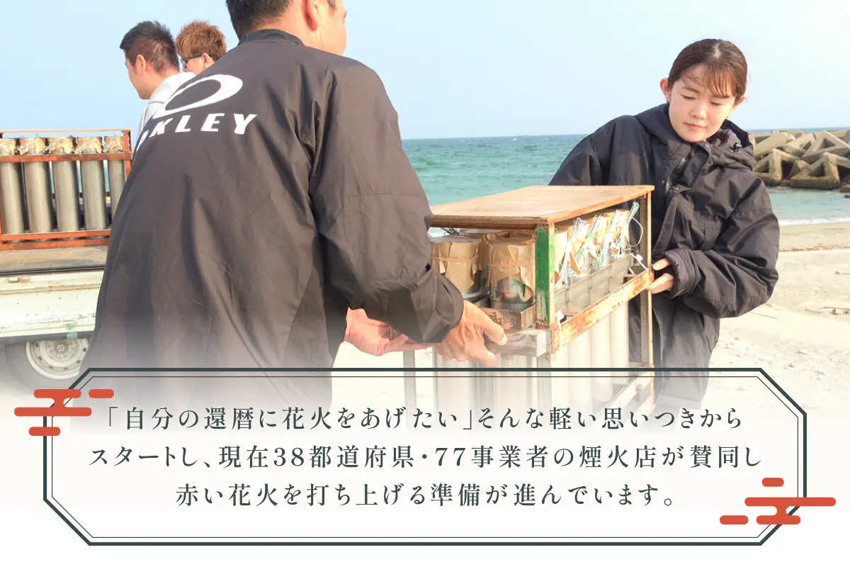 「やりたいけど、お金もないし、場所も決まっていない」―そんな手探りの状態からのスタート。それでも、この想いをかたちにしたいという強い願いから、私はある花火屋さんに思い切って声をかけてみました。「全国で還暦をお祝いする日を作りたい。そしてその日を紅い花火で祝いたいのだけど、協力してくれないかしら?」と。