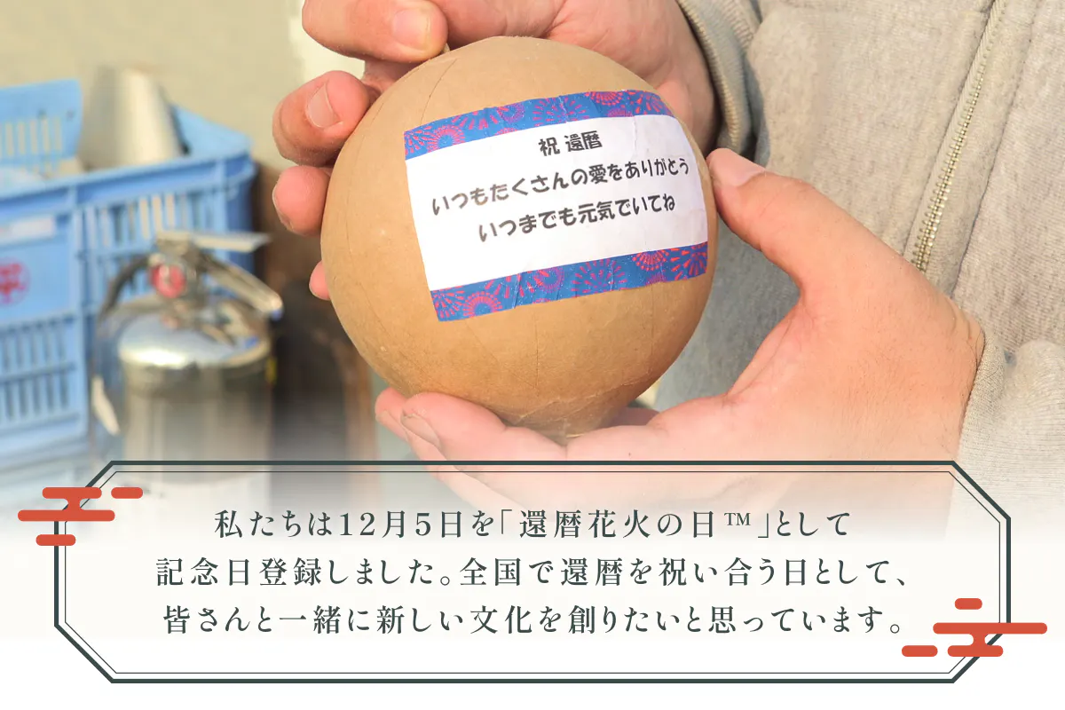 私たちは、この2つをかけ合わせ、12の干支が5回めぐって還暦になる12月5日を“人生の再出発をみんなで祝う日”「還暦花火の日™」として記念日登録し、実現に向けて準備を始めてきました。