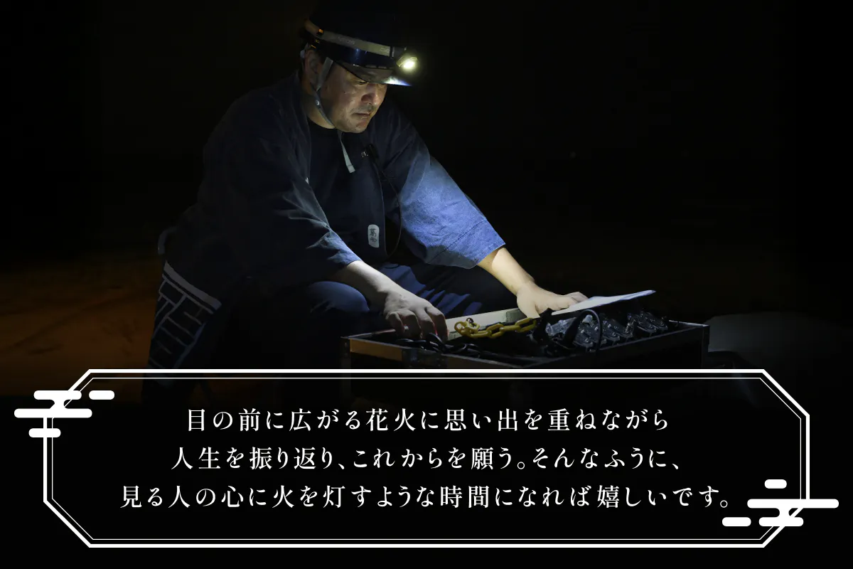 花火を見るなら、自分の大切な人と。そして一緒に、自分たちの歩んできた時間を振り返ってほしい。目の前に広がる夜空に、思い出を重ねながら。人生を振り返り、これからを願う。それが、還暦花火の真の意味です。「お疲れさま、そして、これからも一緒に」と。見る人の心に火を灯すような時間になれば嬉しいです。