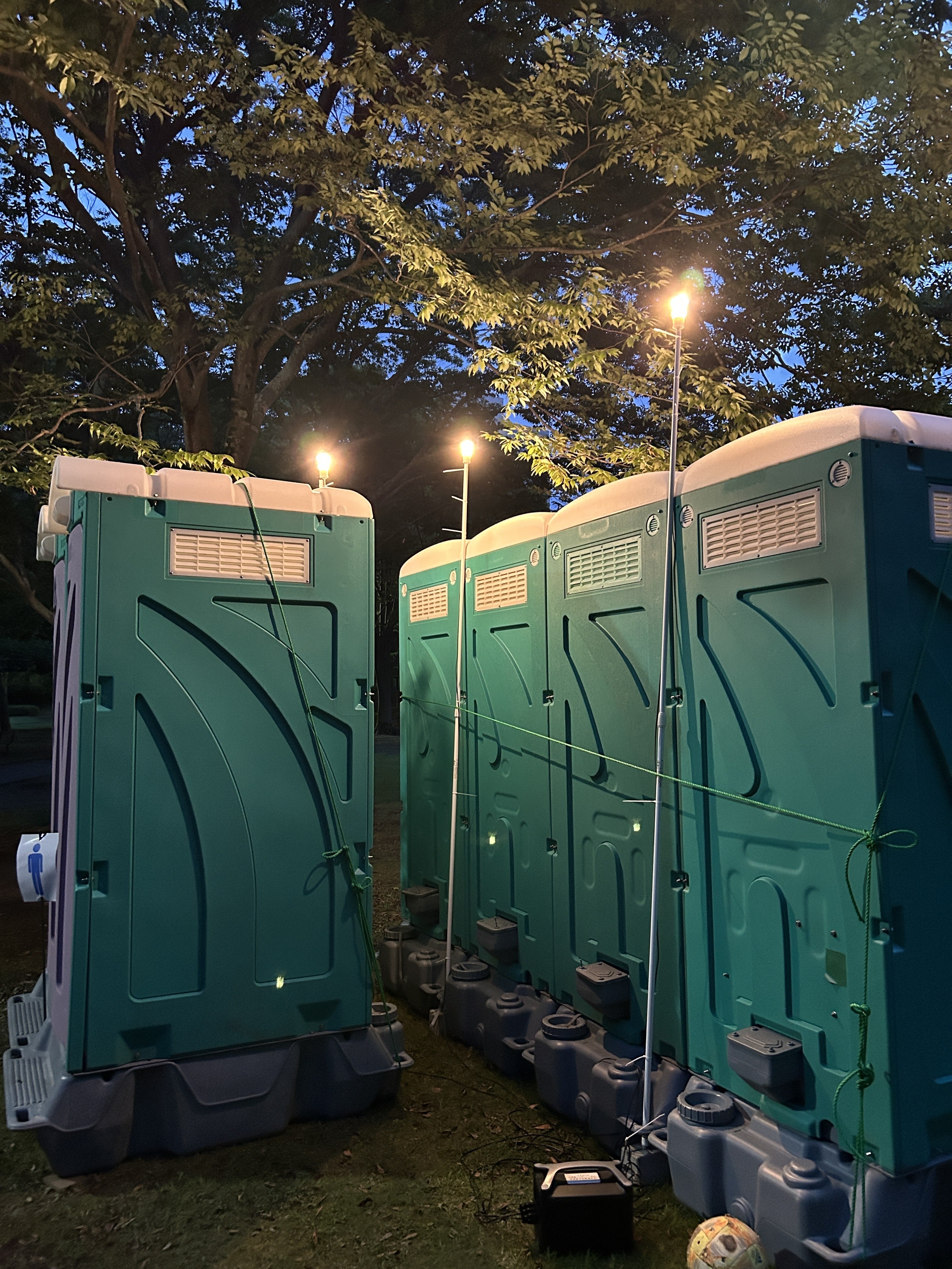 ・バルーンライト&トイレ周辺:トイレ付近にはバルーンライトや小型ライトを設置し、夜間も安心して利用できるように工夫しました。