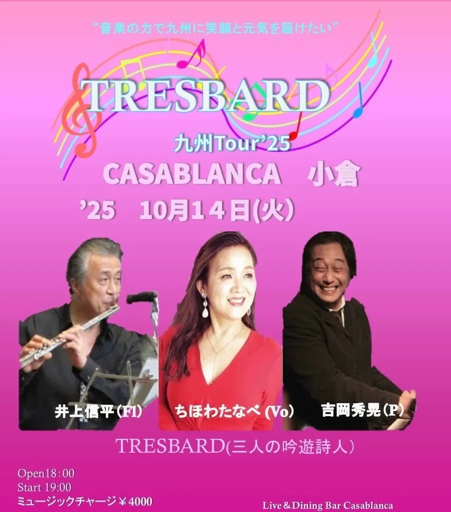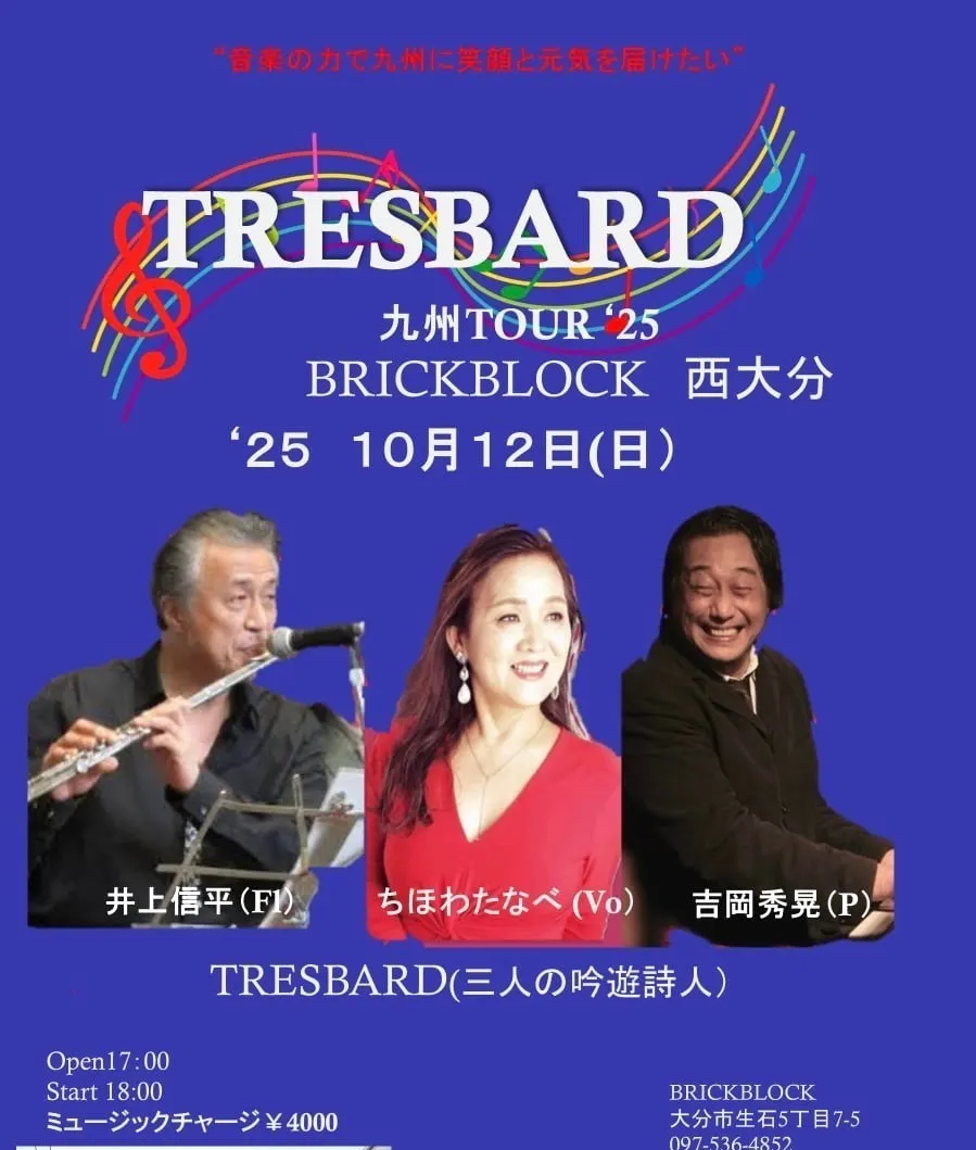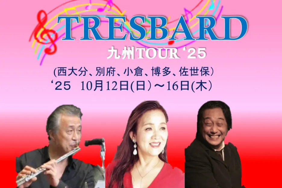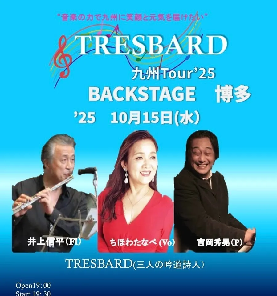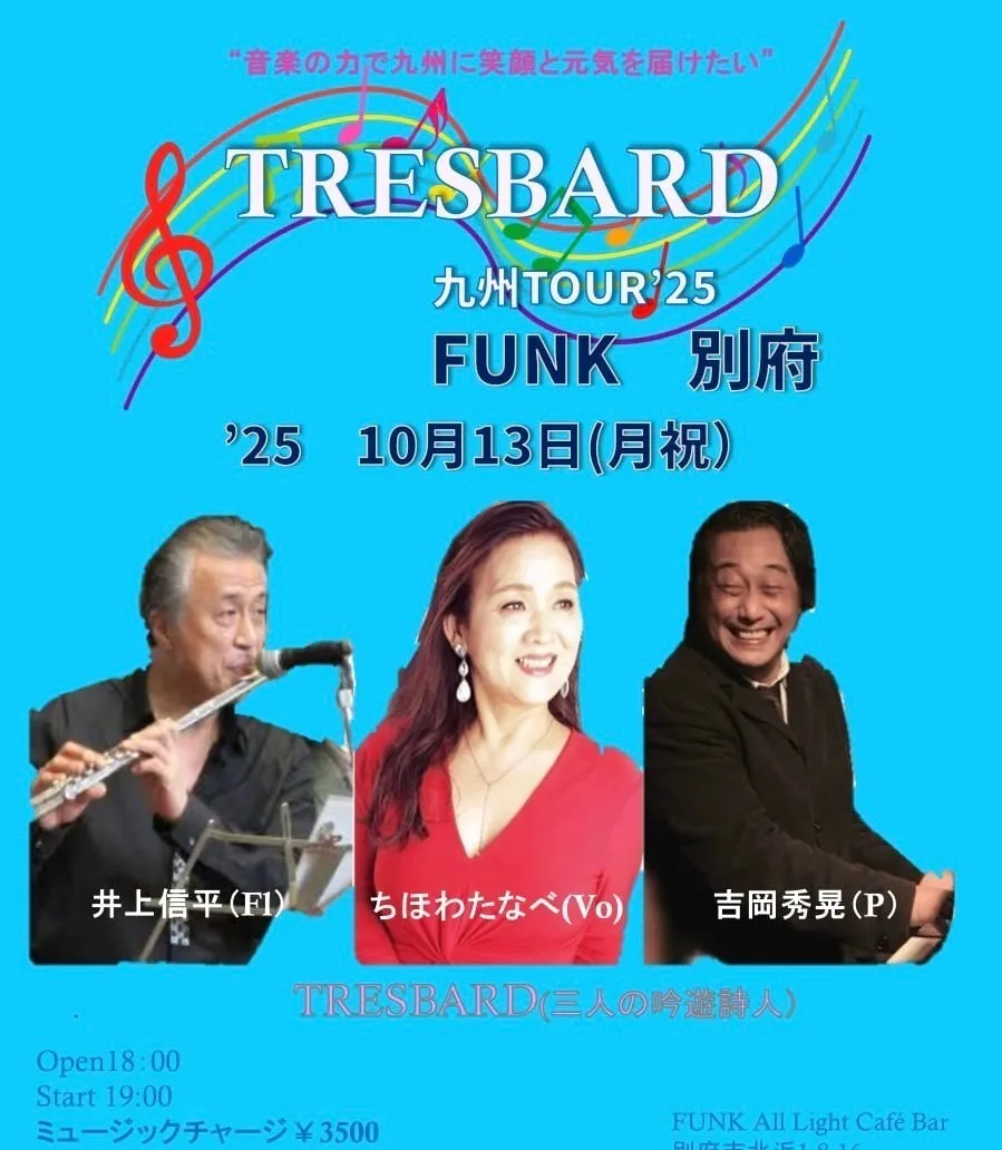 また佐世保島地町にある小学校に伺い唱歌またジャズの歌も届けさせて頂きます!そして大分、別府、小倉、博多、佐世保へと「TRESBARD」のフルート井上信平ピアノ吉岡秀晃とボーカルちほわたなべとで地元の皆様と交流をはかりながら音楽を届けさせて頂きます!