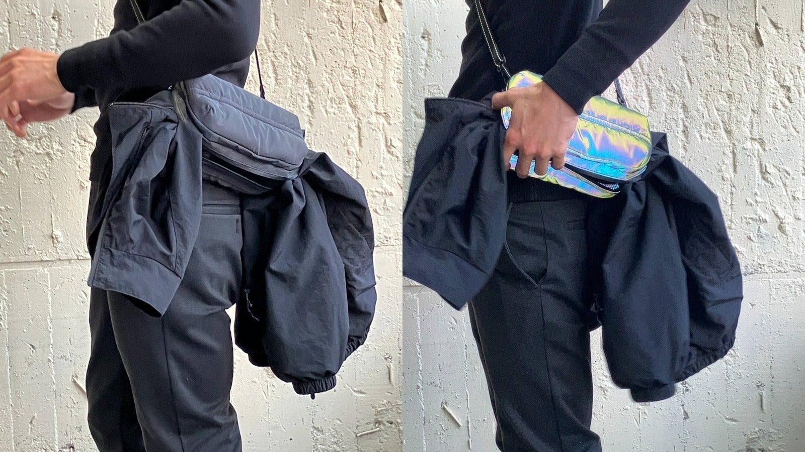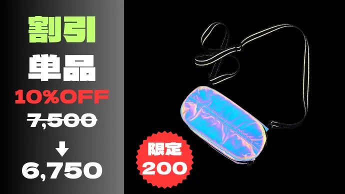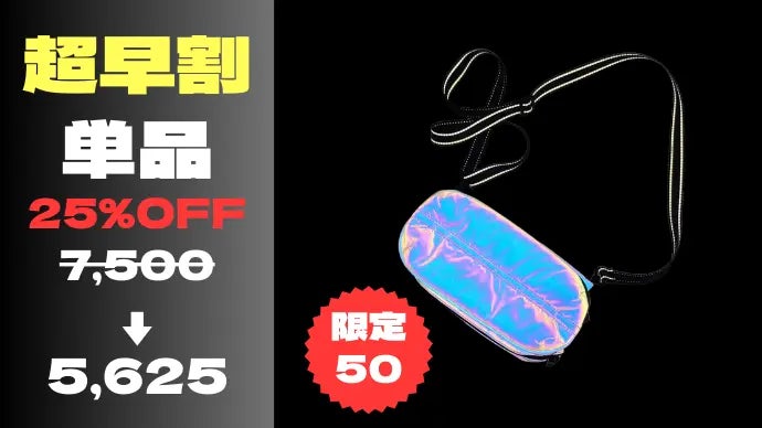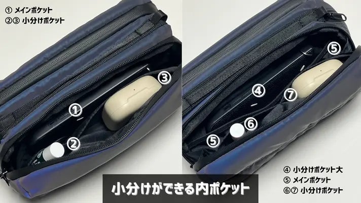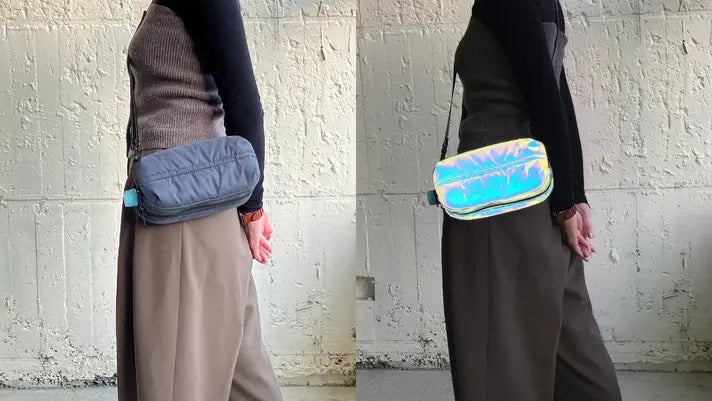 オーロラ反射生地を全面に使い、反射時は全面がオーロラに光る驚きと安全性です。普段使いから、フェス、アウトドア、買い物にも、マルチポケットで使い方は自由自在です。