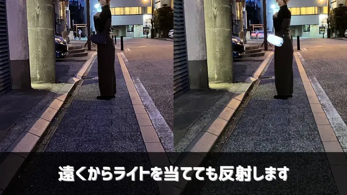 *再帰性反射材(リフレクター)は車のライトやカメラのフラッシュなどの光を浴びた際に反射して発光します。反射材自体が発行するものではございません。