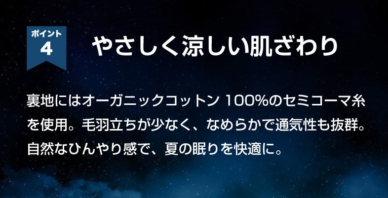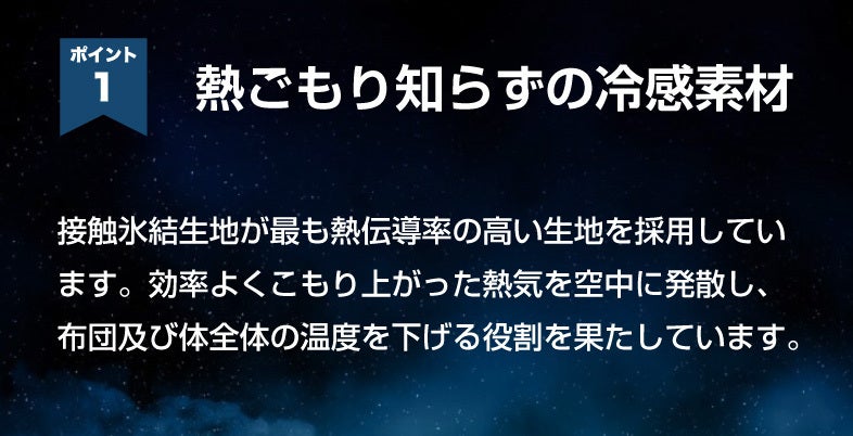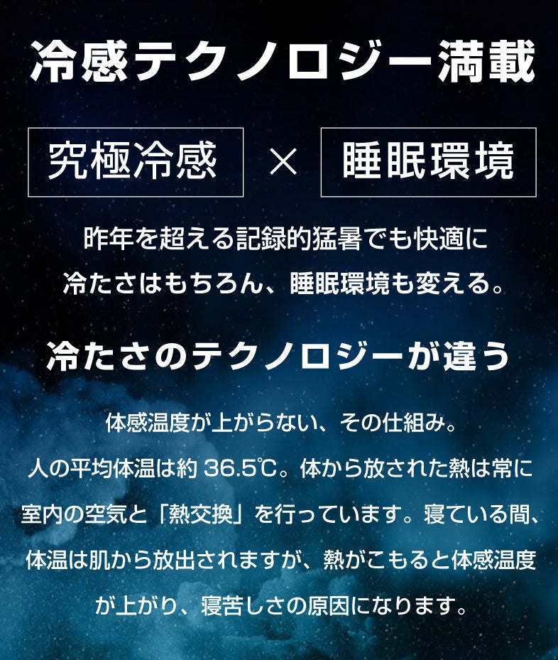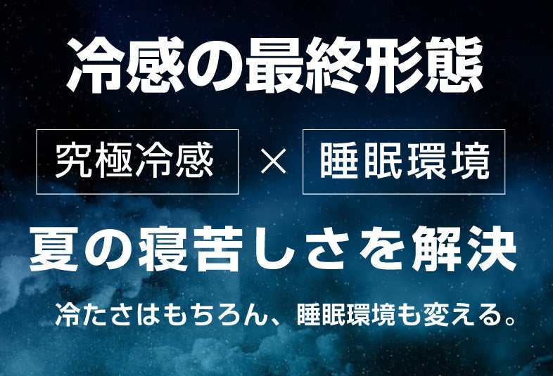 毎年更新される記録的な猛暑でもより快適へ導く究極の冷感テクノロジー夜通し持続する、至高の冷感。寝苦しい季節も、これ一枚で快適な眠りへ。
