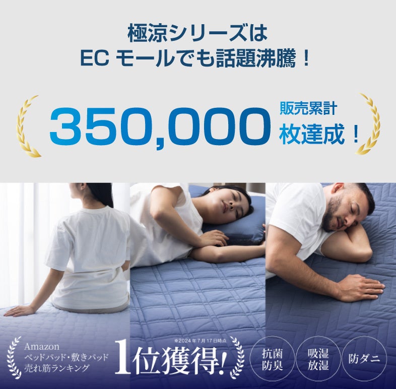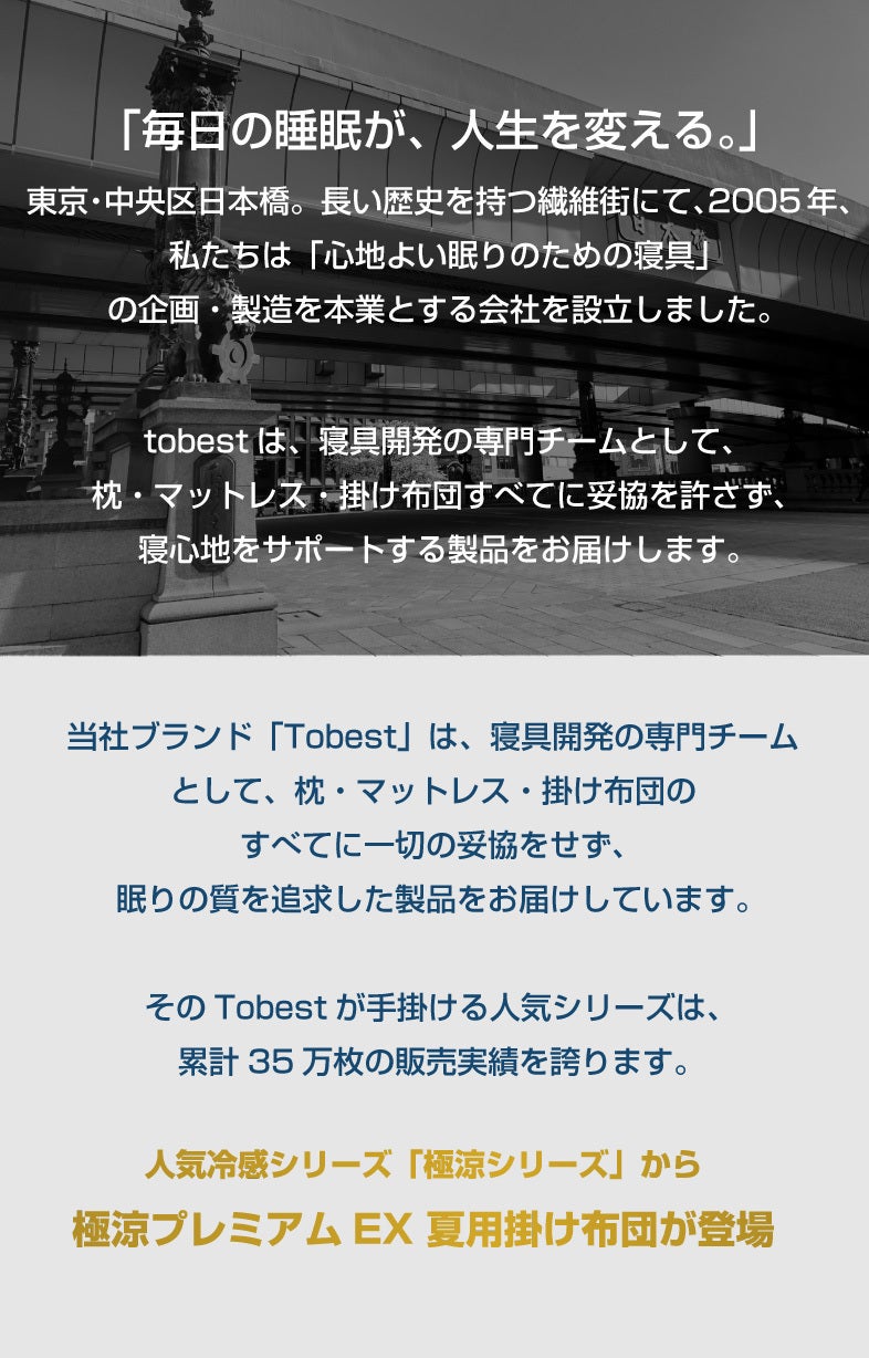 極涼シリーズは、弊社が誇るロングセラー商品であり、年々厳しさを増す夏の暑さに対応すべく開発された、夏に特化した寝具シリーズです。今回、シリーズ初となる掛け布団の開発に挑戦し、試行錯誤を重ねながらも、ようやく納得のいく製品を完成させることができました。この夏、快適な睡眠環境づくりにお役立ていただけましたら幸いです。何卒よろしくお願い申し上げます。
