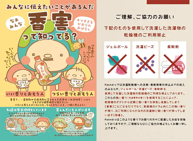 柔軟剤・洗濯ビーズ・ジェルボール等を自宅で使用して洗濯した洗濯物の乾燥機のみの利用を禁止し、「香害」に関するポスターの掲示や店頭での会話を通じて、 「安心して洗濯できる居場所」を広げてきました。