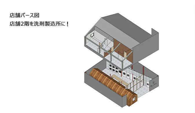 蒸留室・製造室・作業部屋・バックヤード(原材料ストックスペース)を、新たに製造を開始するPanndryのオリジナル洗剤の製造所として、現在未活用(一部倉庫)となっている店舗2階部分を改装し、製造設備を集約・効率的に配置した作業空間を整備しました。