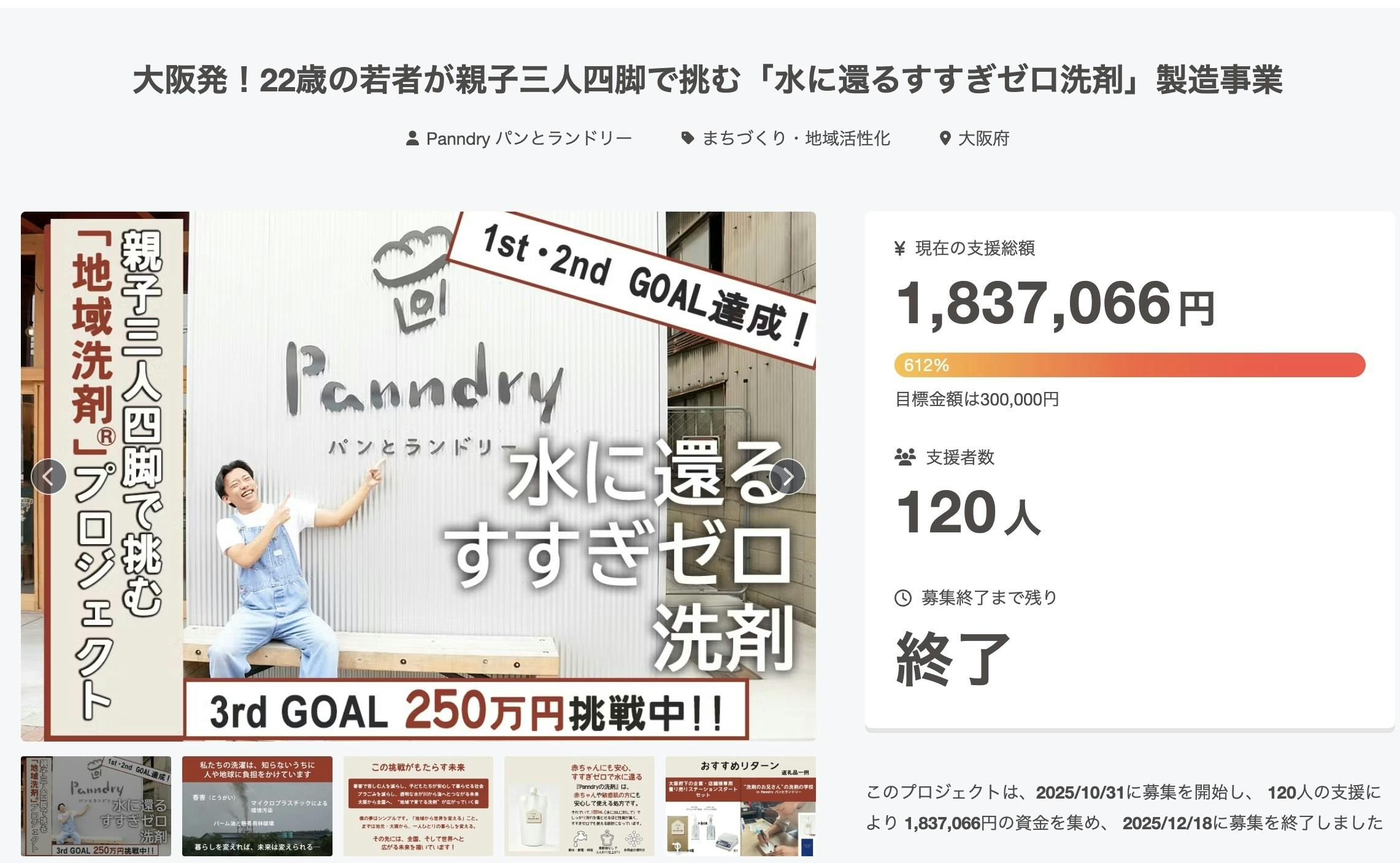 2025/12/19 11:04こんにちは!洗剤のお兄さん せんたくんです!昨日で「大阪発!22歳の若者が親子三人四脚で挑む『水に還るすすぎゼロ洗剤』製造事業」のクラウドファンディングを無事終えることができました!ご支援いただいた方々、拡散してくださった方々、チラシを掲示したり、お配りいただいた方々など、Panndryのクラウドファンディングに関わってくださった皆さまには、心より深く感謝申し上げます!皆さまのおかげで、やり遂げることができました!今回のクラウドファンディングでは、85人もの方々に応援メッセージをいただいただけでなく、総勢120人もの方々のご支援をいただき、総額で1,837,066円が集まりました!改めてにはなりますが、このクラウドファンディングで集まったお金は、今後僕(洗剤のお兄さん せんたくん)が全国の各地域洗剤®︎サテライトを周り、 “本物の洗剤のお兄さん” になるための、学びのための資金とさせていただきます!そして、今回のクラウドファンディングでご支援いただいた方々は合計で120人ですが、120人よりも多くの方々にPanndryが取り組んでいる「香害」や「マイクロプラスチック」の問題を知っていただける貴重な機会となりました。その点に関しましても、誠に感謝いたします。まだまだ始まったばかりですが、これからも少しでも人や地球環境にとって安全・安心な社会へと変えていけるよう取り組んでまいりますので、これからもぜひとも応援よろしくお願いいたします。そして、応援だけでなく、「Panndryのなかまたち」として、「香害」や「マイクロプラスチック」の問題に、共に取り組んでいただけますととても心強く、幸甚に存じます。今後とも引き続きよろしくお願いいたします!! もっと見る