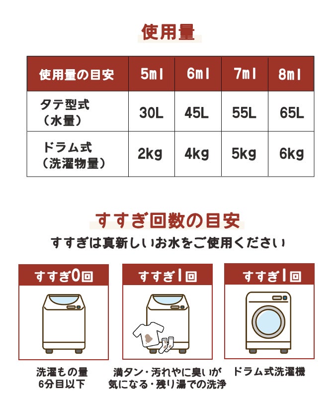 お風呂の残り湯には通常の水道水よりもミネラル分が多いです。これは身体から出たミネラル分によるものなのですが、それも処理しようと洗剤が働いてしまうため、規定量より多くの洗剤を必要としてしまいます。洗いで残り湯をご使用の際は、水道水ですすぎを1回していただくことをおすすめします。