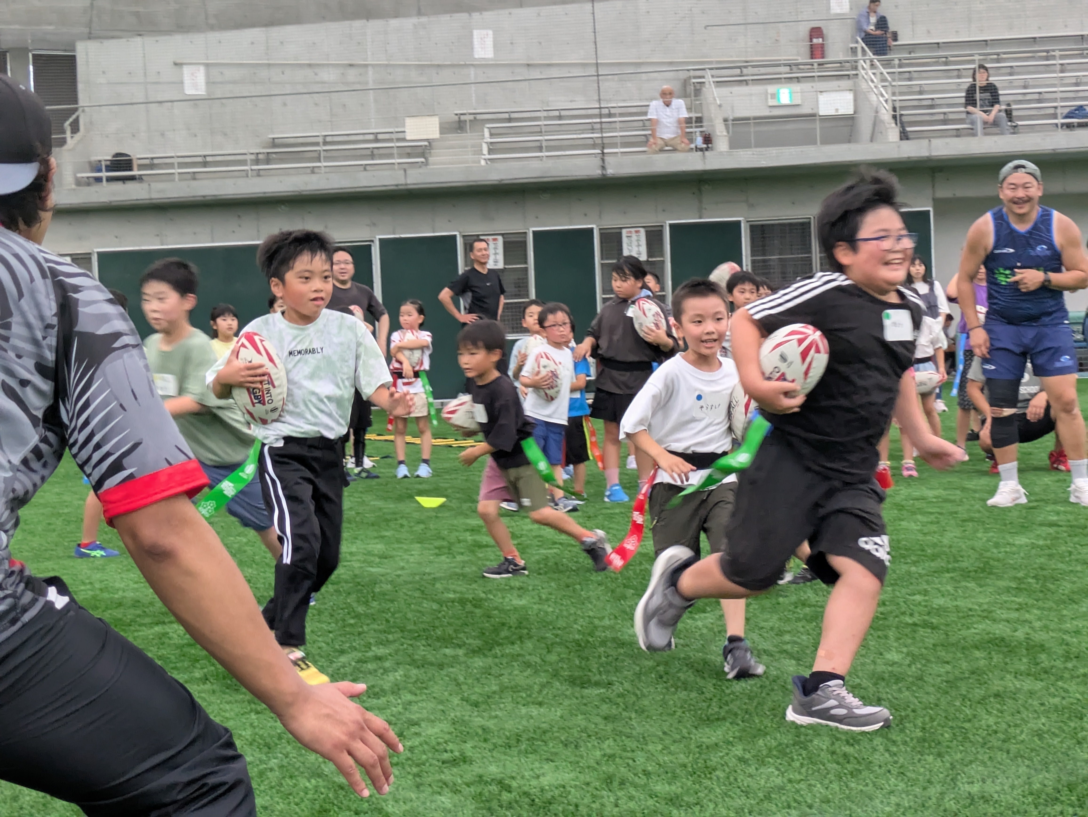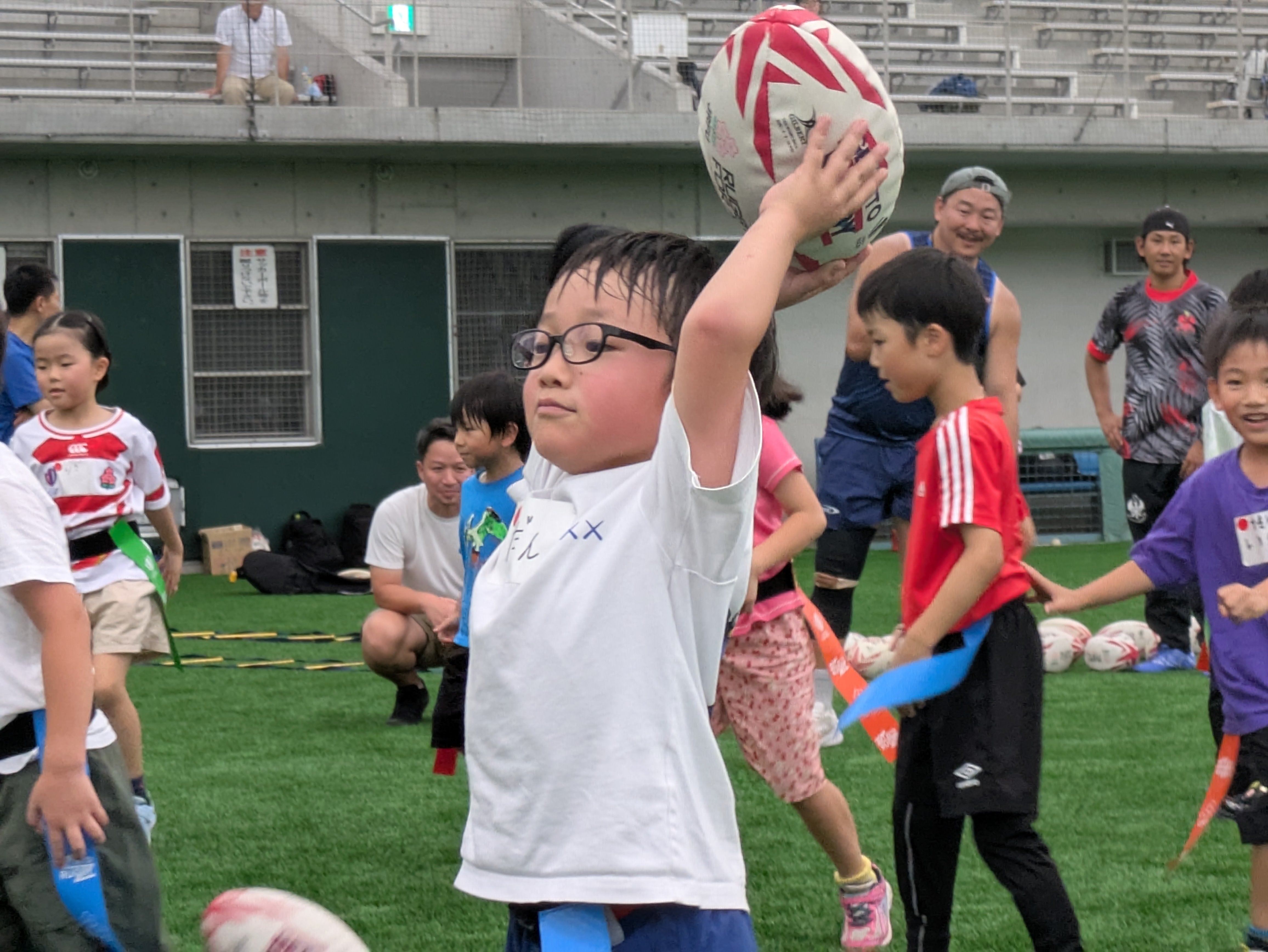 体験会には地元のラグビースクールにもご協力いただき、同世代の子どもと一緒にラグビーを体験していただきます。