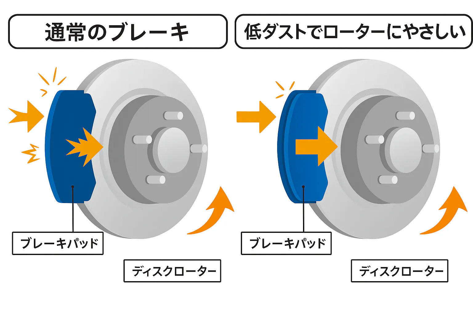 ディスクパッドの摩擦係数が高すぎる=交換後にブレーキ鳴きが発生する場合、パッドの摩擦係数が高すぎることがあります。輸入車は高速走行を考慮した摩擦係数になっていることがありますが、日本の走行環境には適さない場合があります。低ダストパッドは日本の走行環境に合わせて設計されており、鳴きにくい特性があります。