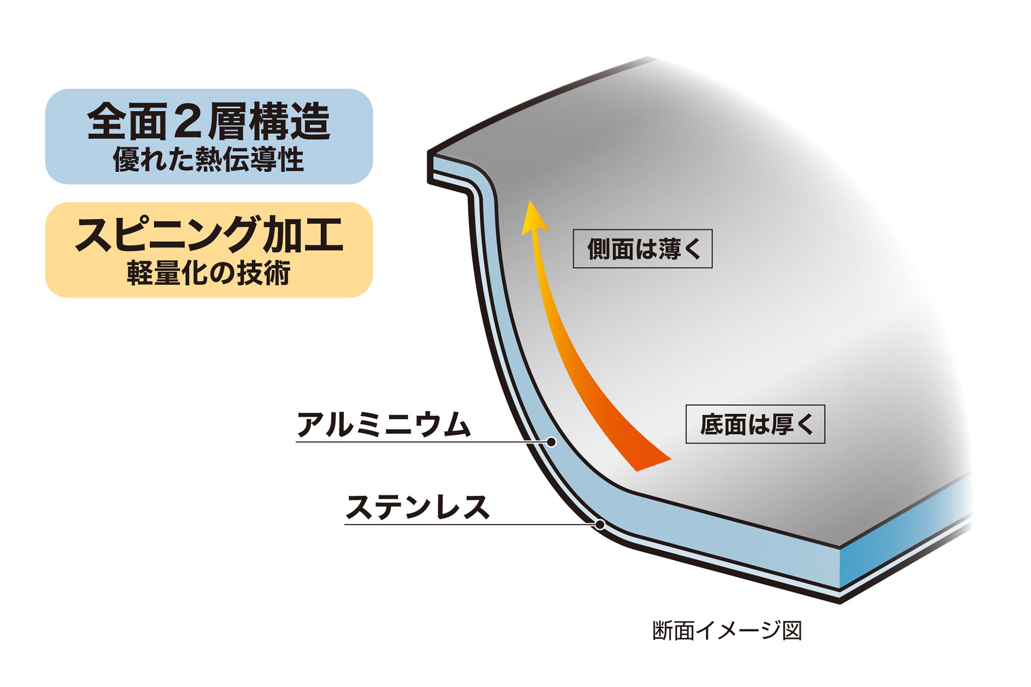 優れた熱保温性のある『ステンレス』と高い熱伝導性の『アルミニウム』で全面均一加熱。