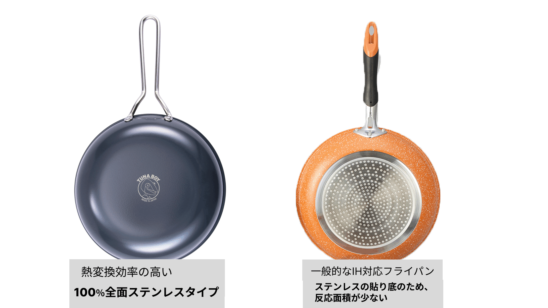 実は一般的なIH対応のフライパンでは、裏面の貼底であるステンレス部の面積が少なくIH調理器の最大火力で調理する事ができません。