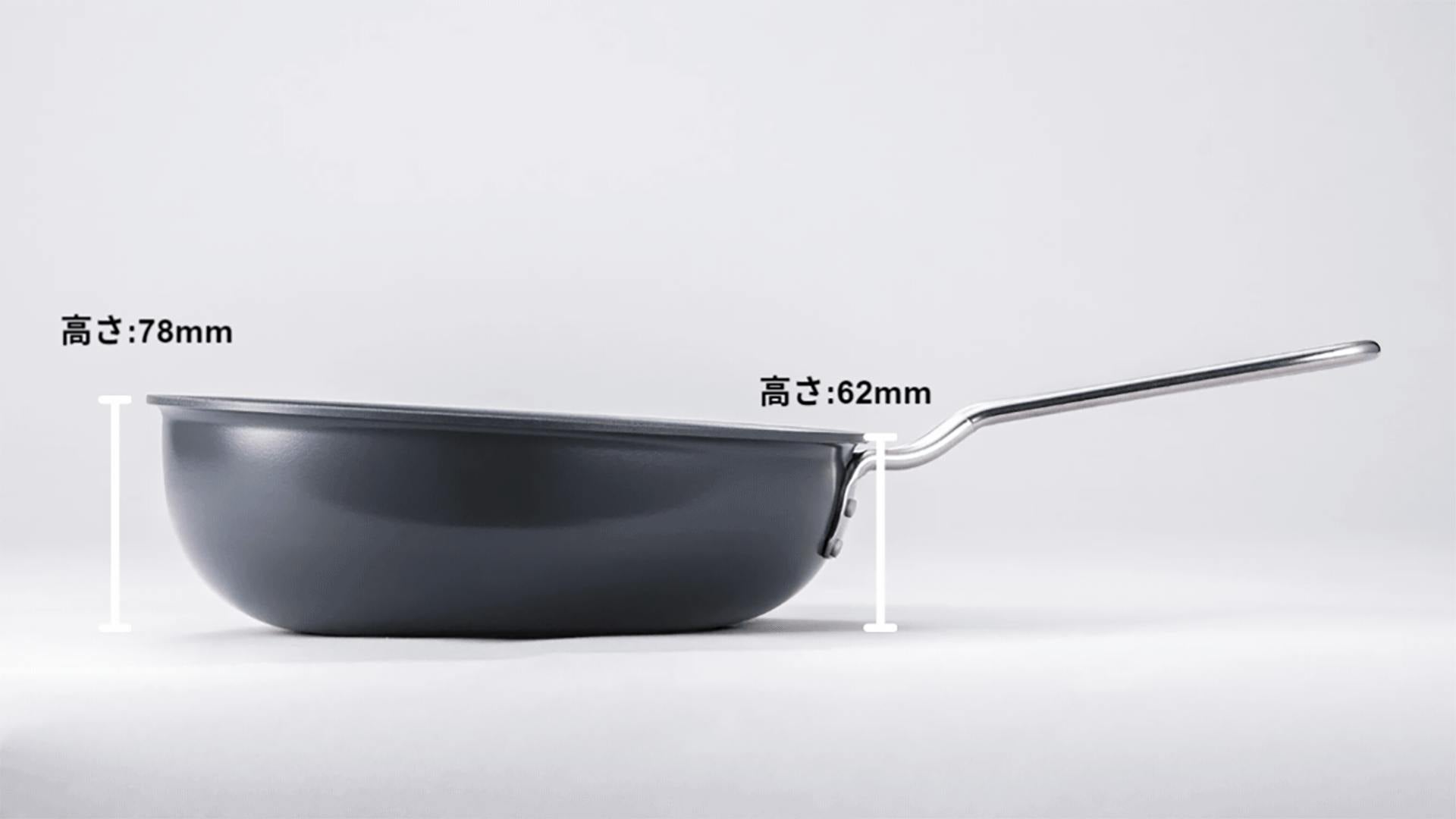 手前側が低くて奥側が高い構造。だから食材が飛びちらない!22㎝サイズで深さがあるから、とっても煽りやすい!! この一台ですべて料理に対応できる優れもの