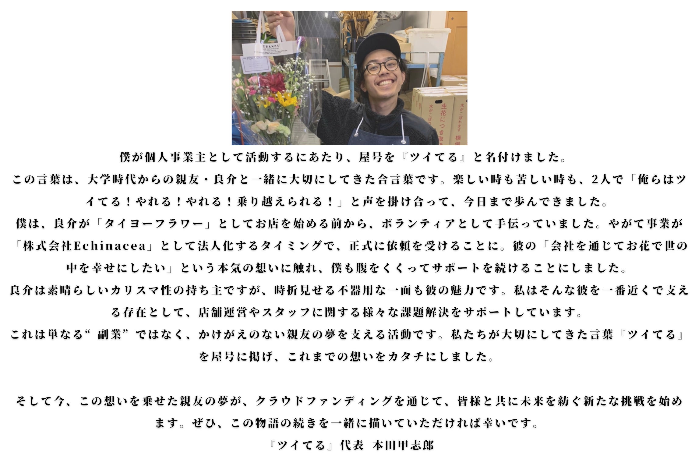 その後、花屋「TAIYOFLOWER」との出会いで、花が人を癒し、笑顔を生み出すという力にも感動しました。
