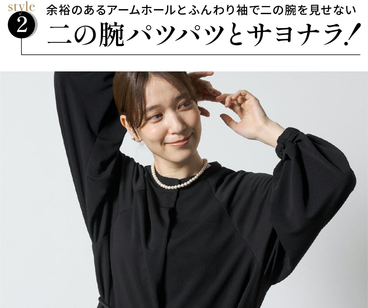 肩から腕のラインを美しいラグランスリーブが包み込み優しい雰囲気を作ります。気になる二の腕もカバーします。