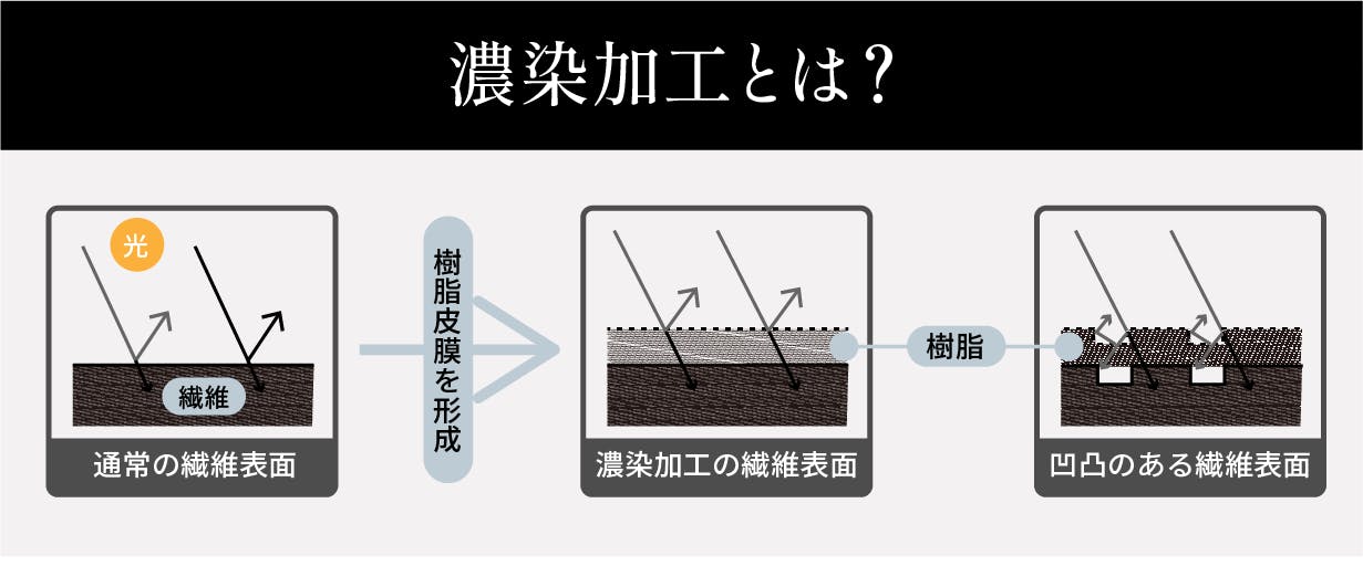 繊維表面に表面がクレーター上になっている樹脂皮膜を形成し、反射率を抑え濃色効果を発揮。加えて繊維上にも凹凸を作り上げ、更に深みのある黒を表現します。