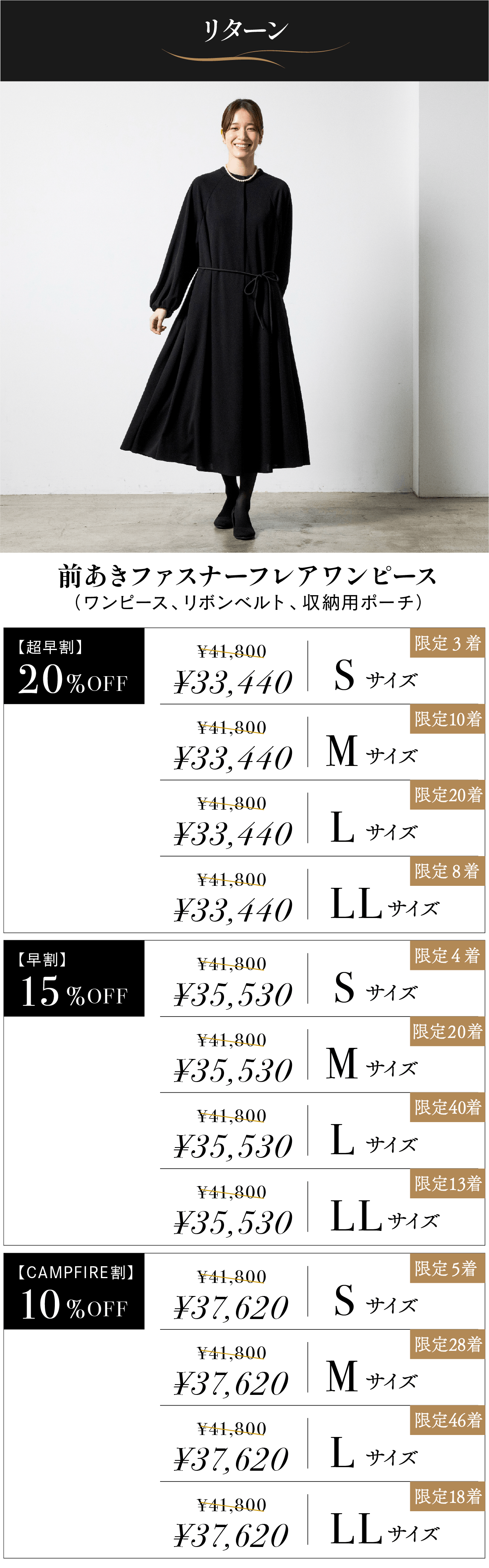 • ご支援者の皆様この度は、当プロジェクトをご支援頂き誠にありがとうございます。ついに、プロジェクト終了まで残すところあと7時間となりました!!*超早割20%OFF(¥8,360お得)がサイズにより完売となりました。お早目にご注文を頂けますと幸いでございます。プロジェクトページはこちら https://camp-fire.jp/projects/860276/view?list=watched美しくて品格のあるブラックフォーマル。 特別な日に着用する特別な一着ですが、お手入れや持ち運びに気を遣うものです。 そんなブラックフォーマルの「取扱いにくさ」に革命を! 体型カバーにとことんこだわった万能ワンピース! 「シーンレス」かつ「エイジレス」普段から長くご愛用頂けるプロダクトが完成しました! ■【スタイルレス・エイジレス・シーンレス】体型も年齢も包む美シルエット、どんなシーンも着回し自在 ■「洗濯可能」「畳んで持ち運べる」機能に「静電気防止テープ」「デオドラント効果ネーム」をプラス。 ■【こだわりのデザイン】前開きスタイルで着脱らくらく。リボンベルト付きでアレンジも自由自在!引き続きのご支援を賜りますようお願い致します。 もっと見る