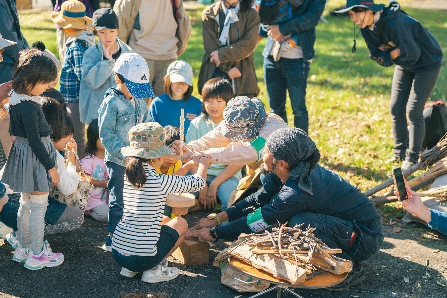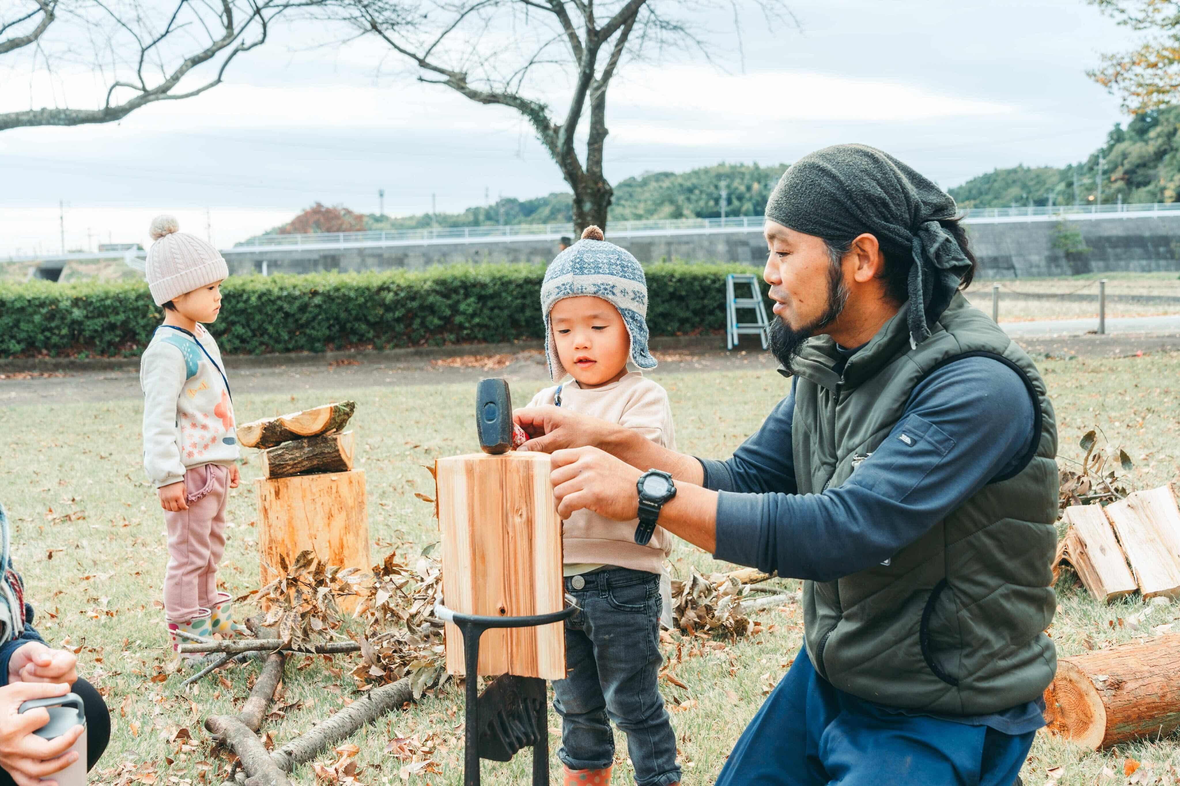 薪割りも火おこしも、こどもたちがチャレンジ。