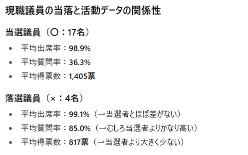 もう少し簡単に言うと、議会で一生懸命している議員さんより、あんまり質問していなくても当選する議員さんがたくさんいるということです。