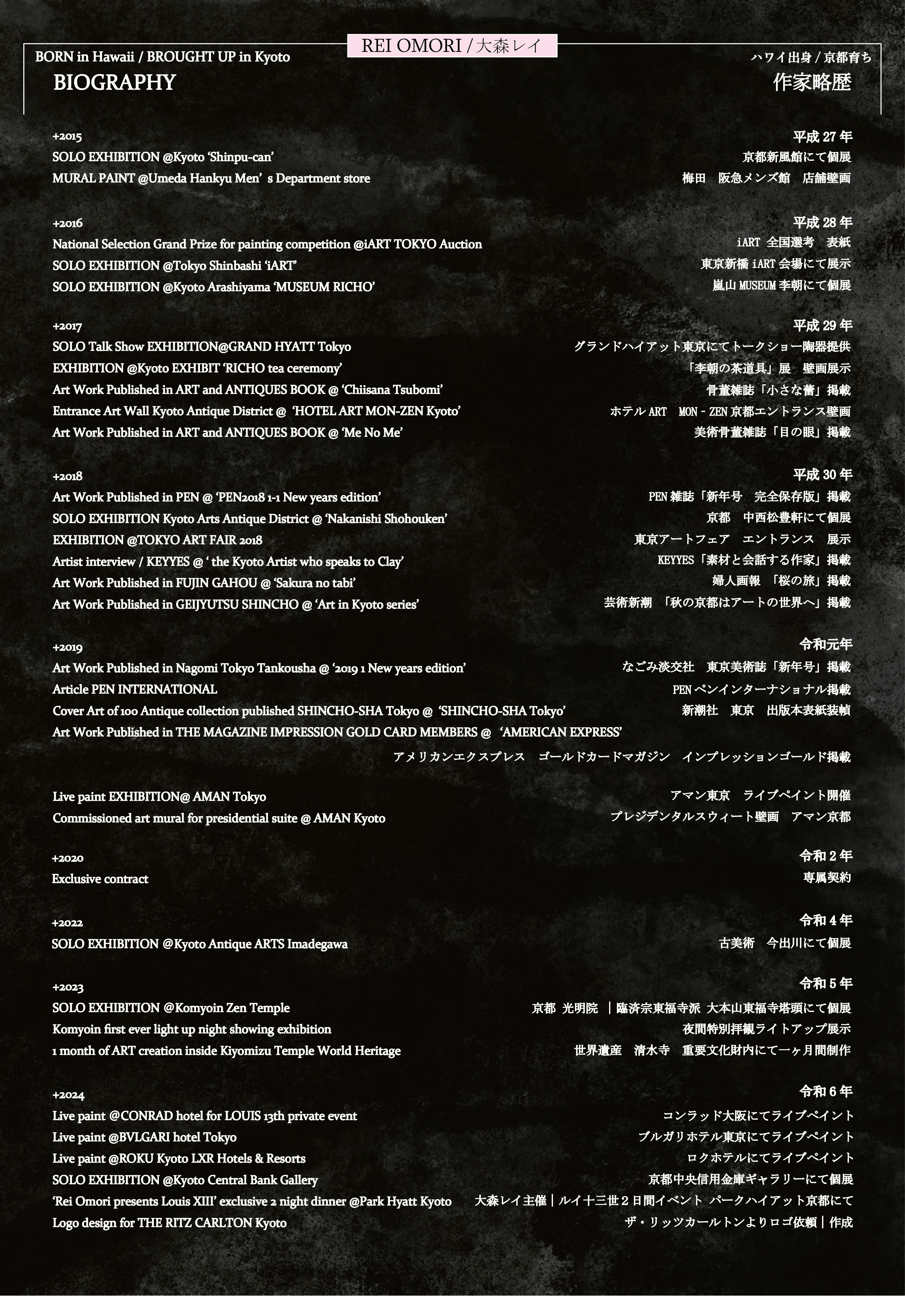 世界的ラグジュアリーリゾートホテルAMAN京都のプレジデンシャル・スウィートルーム用の3メートルの壁画制作や、ザ・リッツカールトンのロゴ作成など、その挑戦は各方面からの評価を得ている。
