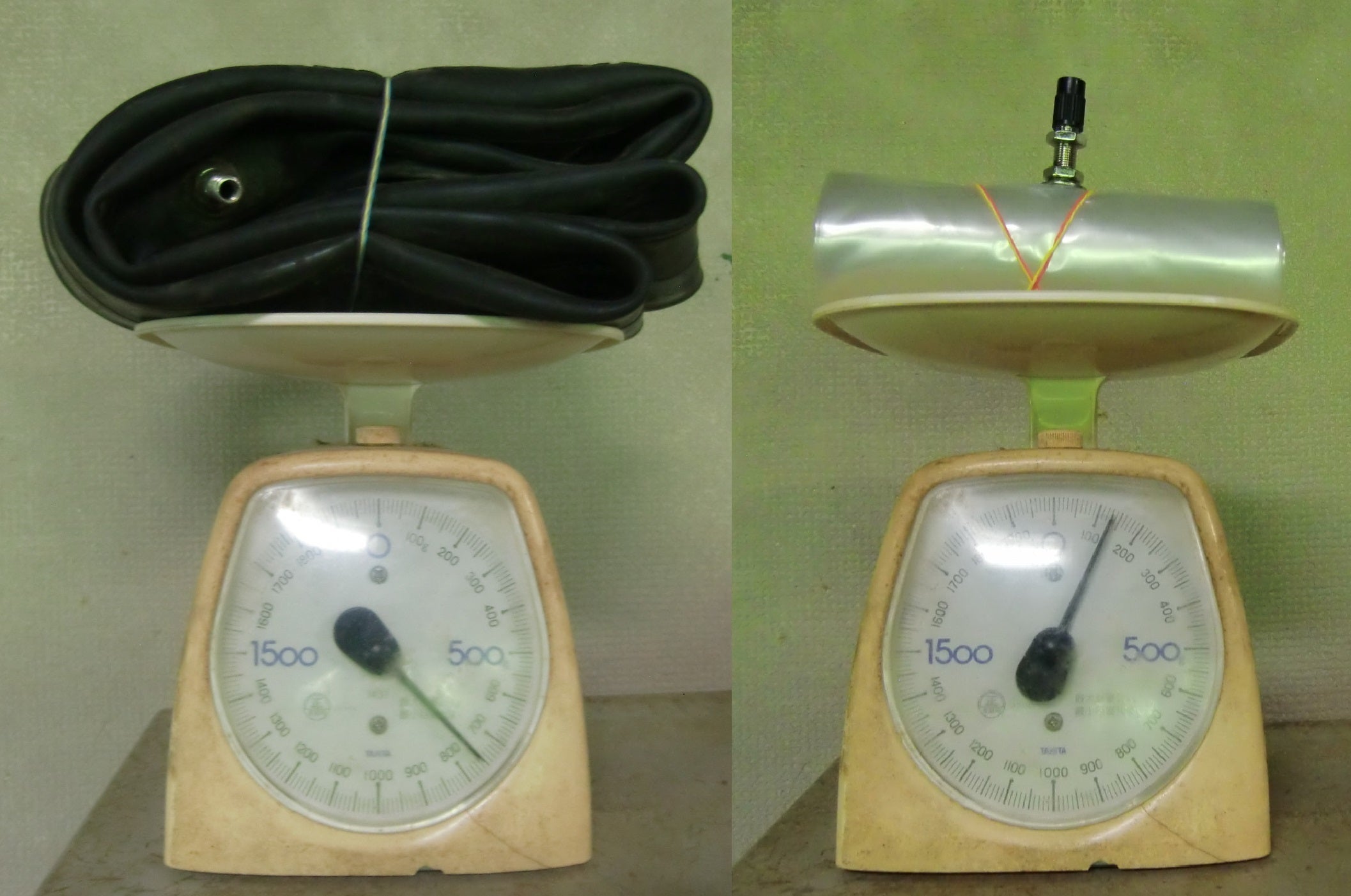 左が従来のノーマルゴムチューブ750gあるが、同サイズのTPUチューブは140gしかない。ゴムチューブはゴムの厚いヘビーチューブになると1kgを超える。