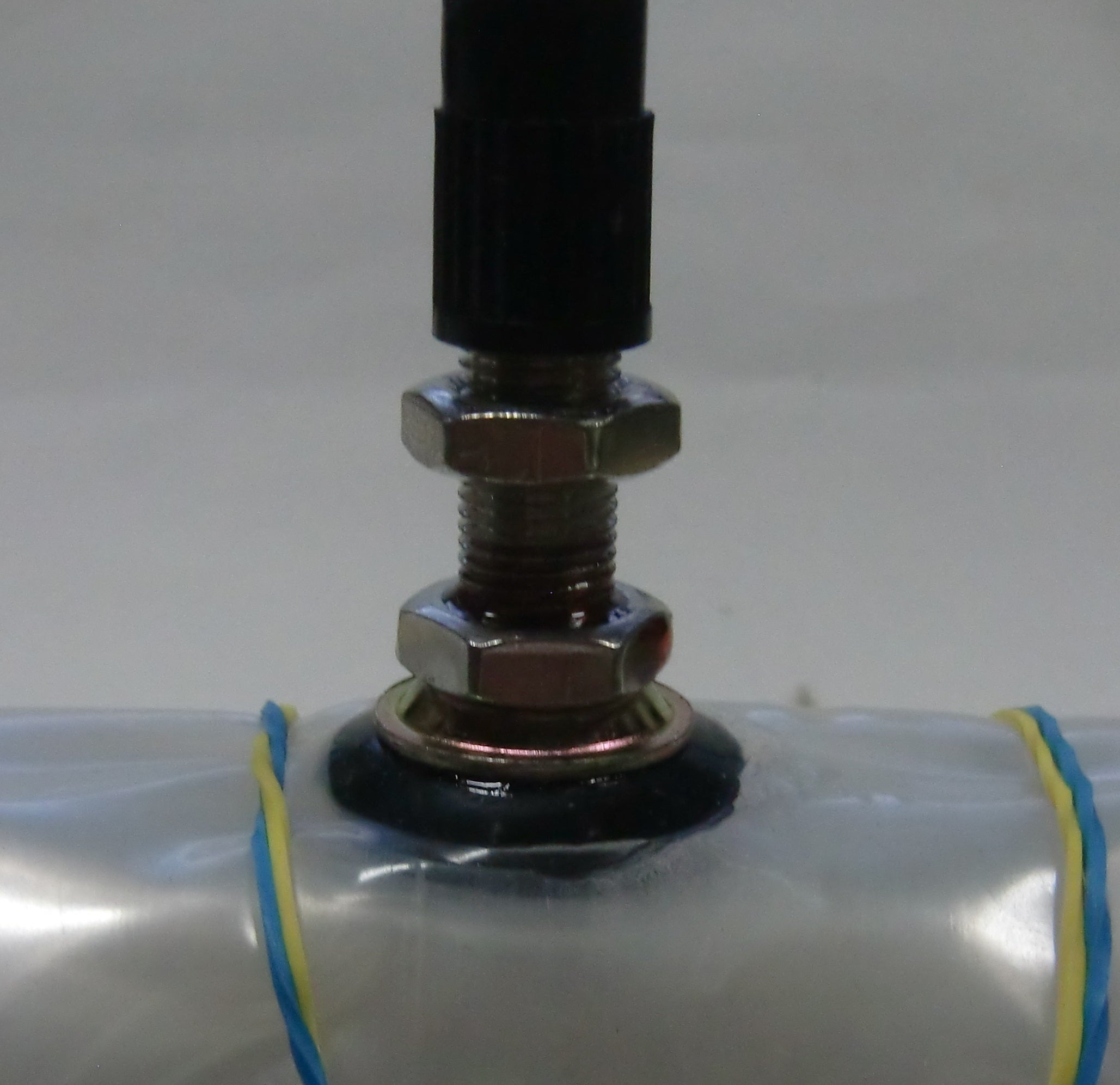 そこで、バルブのナットを利用して、内部から止めるようにバルブの取付方法を改良しました。引っかかりの原因だったバルブのゴム部分を切断して、内部にOリングを入れ、空気漏れを防いでいます。ナット、接着剤、Oリングの3つでバルブを固定しています。この方法に代えてから、バルブに関する不具合はなくなりました。また、チューブの接合部も接合部分を広くするなどして万一の剥がれを防いでいます。