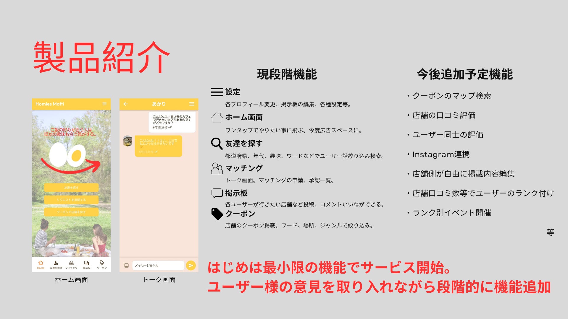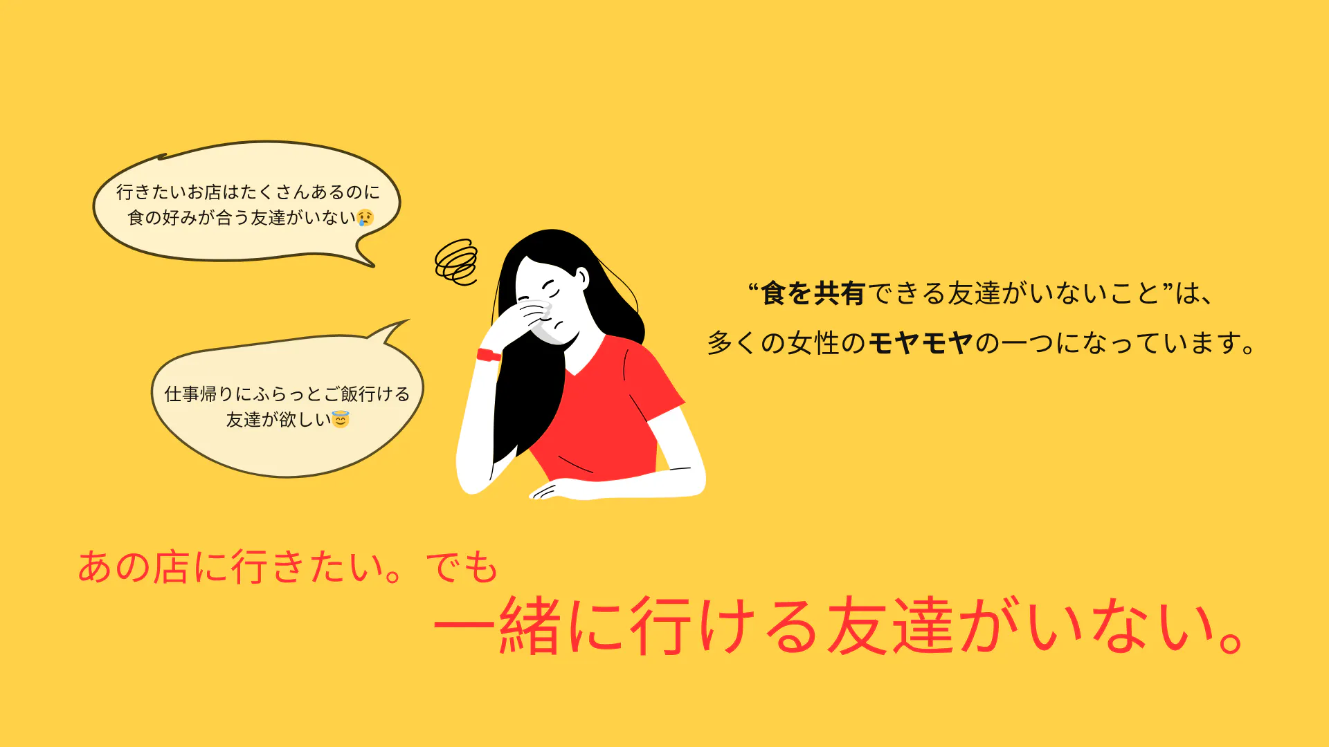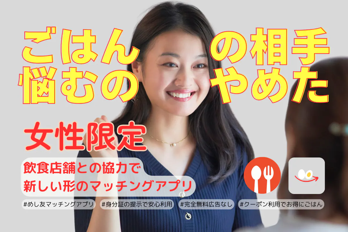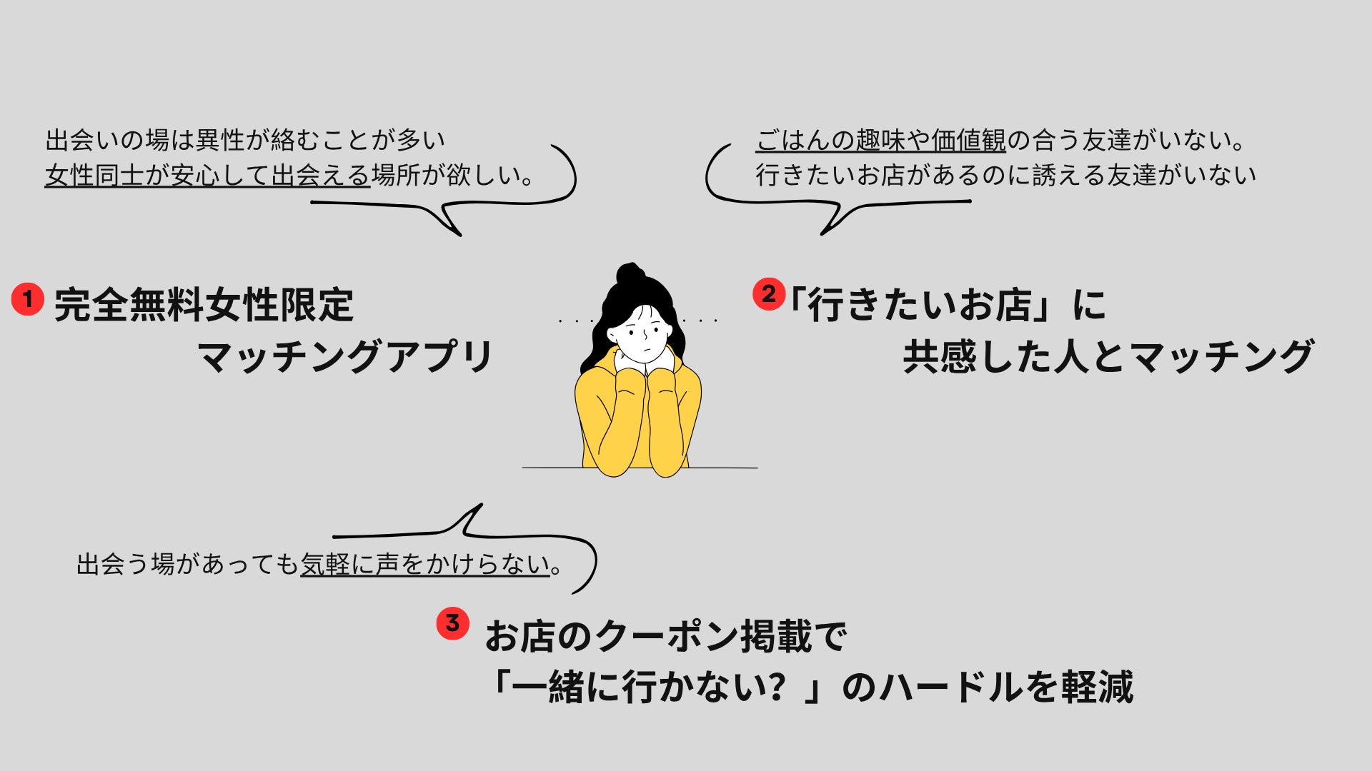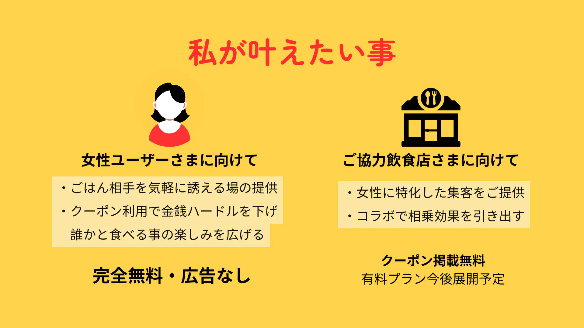 飲食店さまとも協力しながら女性が 安心して気軽 に「ごはん相手」と出会える場をつくり、完全無料・広告なし でスタートして多くの方に楽しいごはん時間を届けたい。