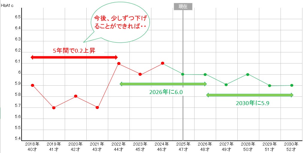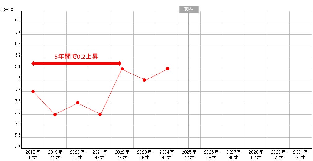 以下は、私の健康診断結果(HbA1c)の年別推移です。