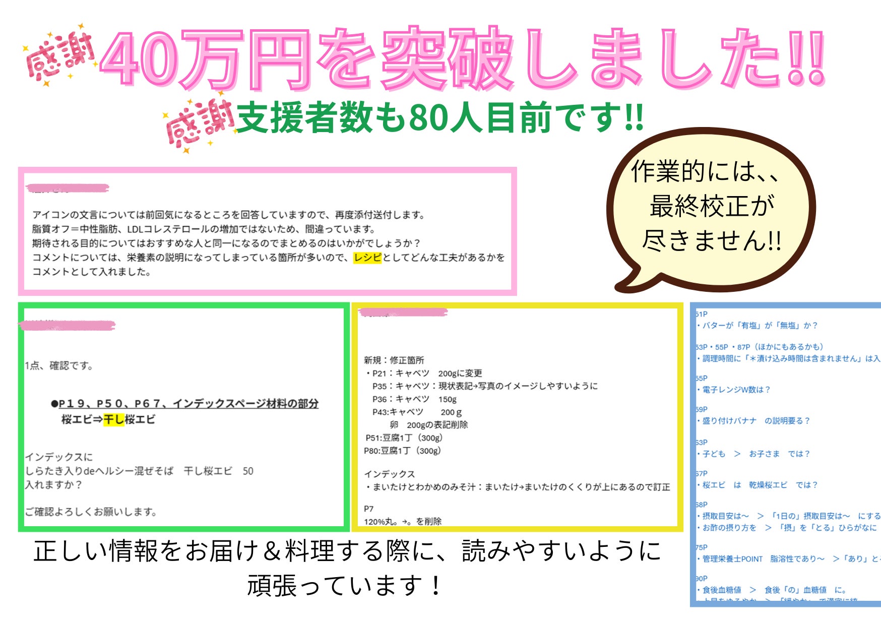 2026/01/31 09:00支援額が40万円を突破しました!!ご支援、ご拡散いただきまして、誠にありがとうございます。周りの方にもご紹介いただけると幸いです。。只今、製本作業としては、最終校正中!前回の活動報告から1週間以上経ちますが・・レシピ本を作ることが初めてなので、なかなかに苦戦していますが、正しい情報を、料理する際に読みやすい、料理しやすいような状態でお届けすることを、みんなで目指しています!ちなみに、「桜エビ」は私たちの地元静岡県の名産です! もっと見る