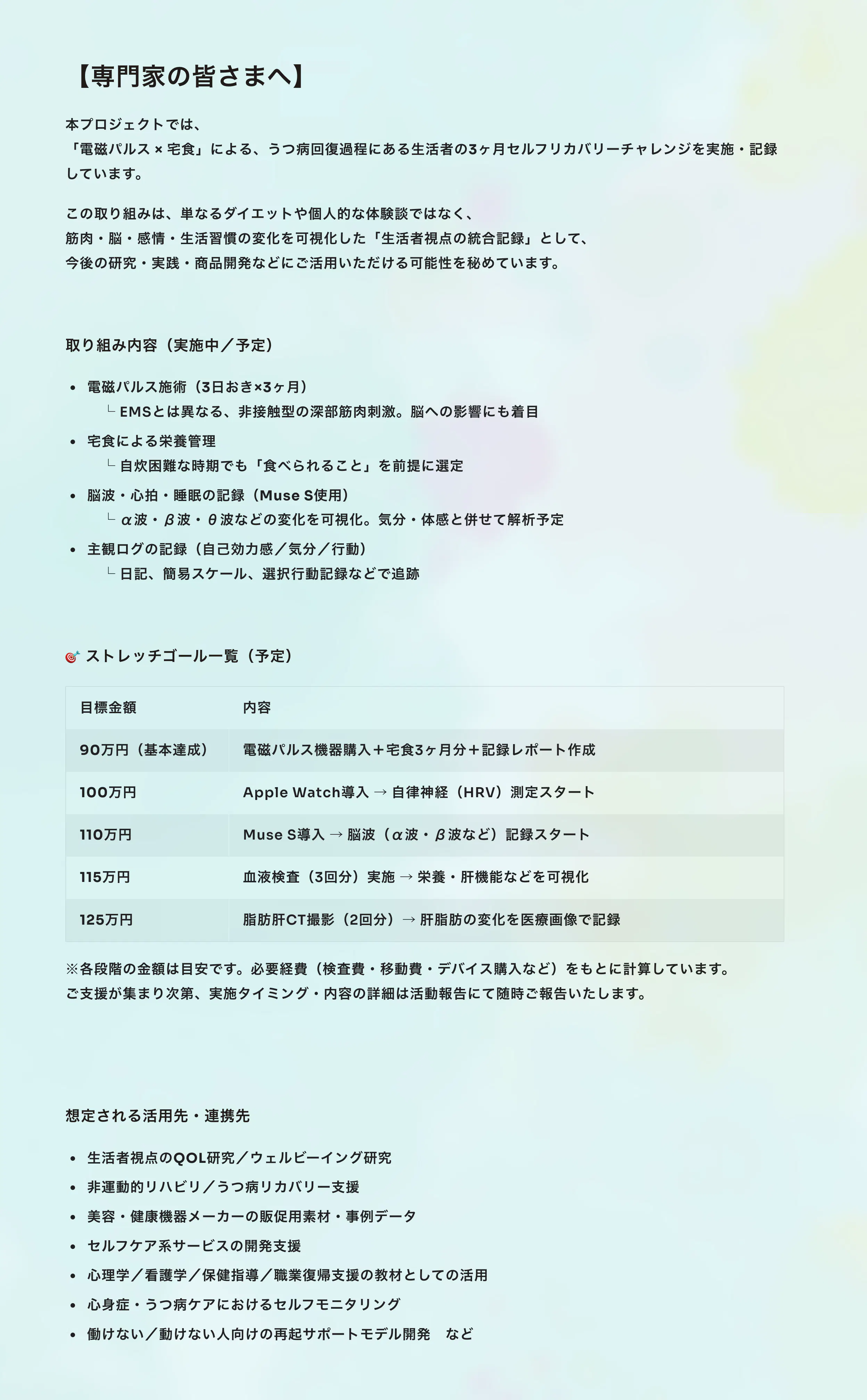 ・現在はどの電磁パルスで3ヶ月のチャレンジをするのか、検討中です。このプロジェクトを知った美容機器メーカー様から、「ぜひ使ってほしい」というお声をいただくことができましたら、大変嬉しいです。