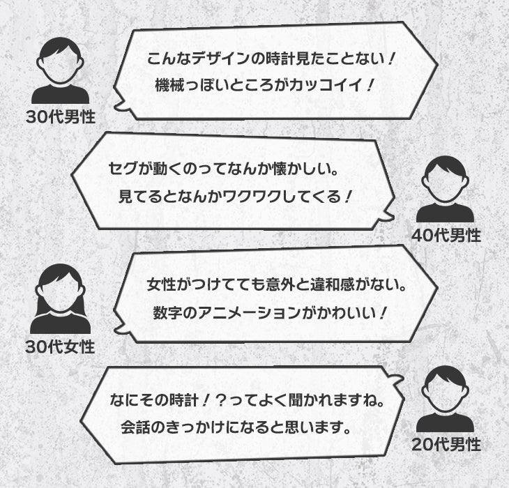 身に着けるシーンを選ばず、老若男女誰にでもおしゃれでカッコいいレトロな時計を楽しむことができるようにデザインされています。